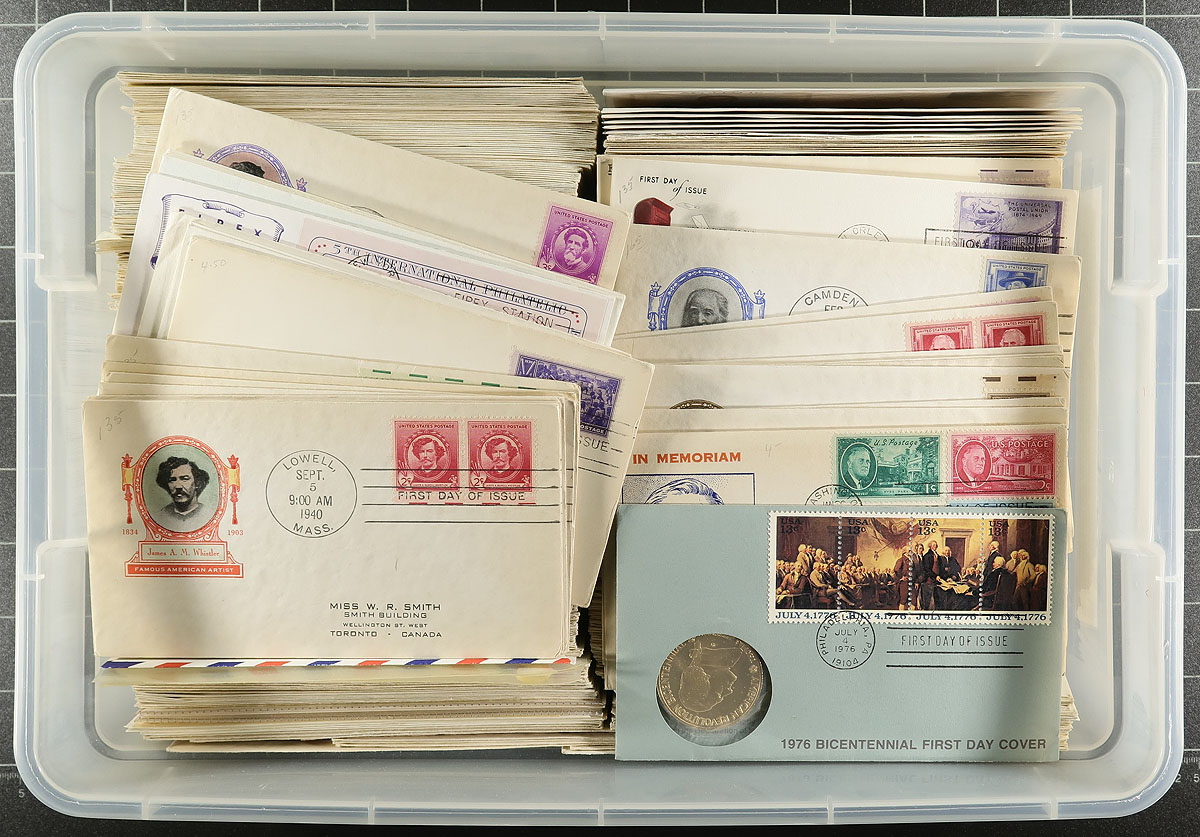 Nice collection of roughly 750 different United States first day covers, 1940's-1970's, filling a small tub, noting mostly single frankings and many having colourful cachets, including a few 1970's "Colorado Silks". Generally unaddressed with a few better values, with a probable high total retail value, overall fine to very fine. Estimate =