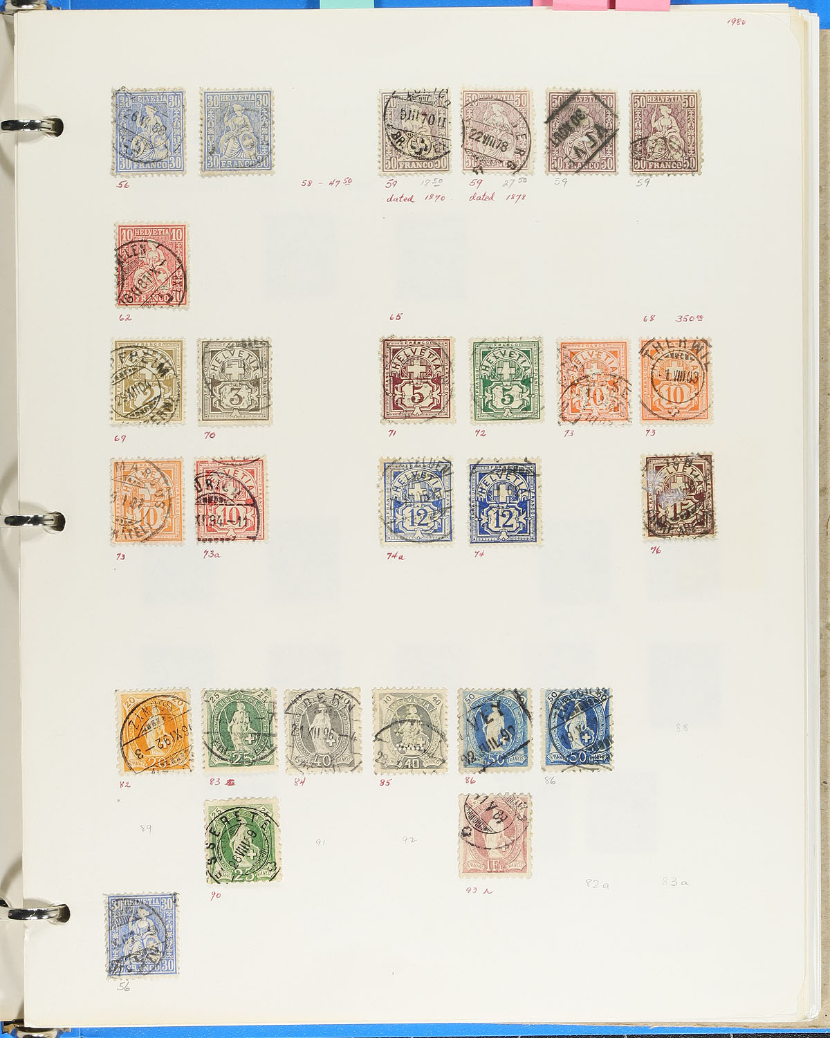 Lovely study group of used Switzerland, 1850's-1930's, containing roughly 650 stamps on homemade pages. Many of the stamps have been collected for town cancels and types, including cds, bridge, slogan and a few others, along with different printing types, with many of the items identified by the owner. A very interesting lot for the Switzerland or worldwide postmark collector, a few faults with the early stamps, overall fine to very fine, with online photos showing a sampling. Estimate =