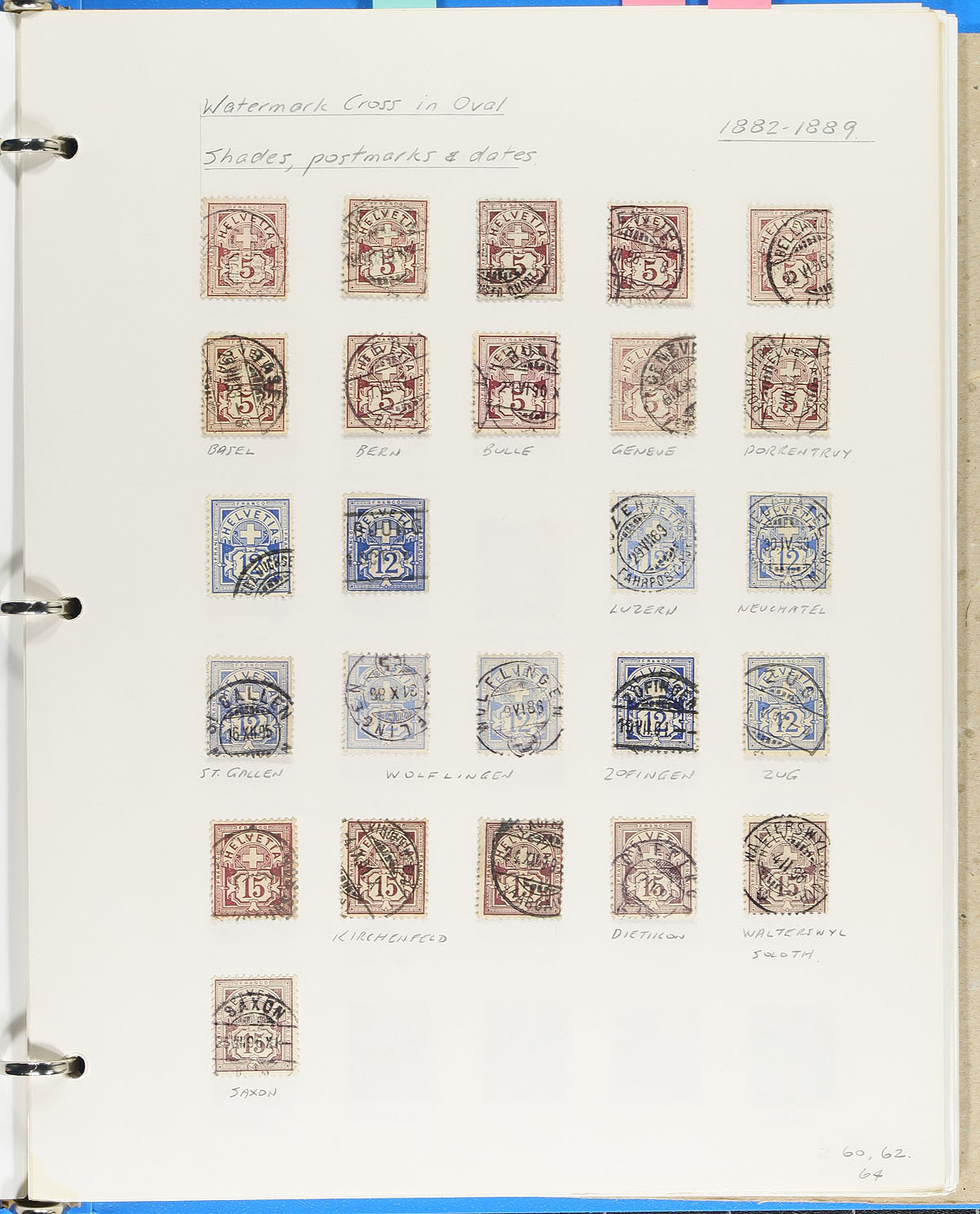 Lovely study group of used Switzerland, 1850's-1930's, containing roughly 650 stamps on homemade pages. Many of the stamps have been collected for town cancels and types, including cds, bridge, slogan and a few others, along with different printing types, with many of the items identified by the owner. A very interesting lot for the Switzerland or worldwide postmark collector, a few faults with the early stamps, overall fine to very fine, with online photos showing a sampling. Estimate =