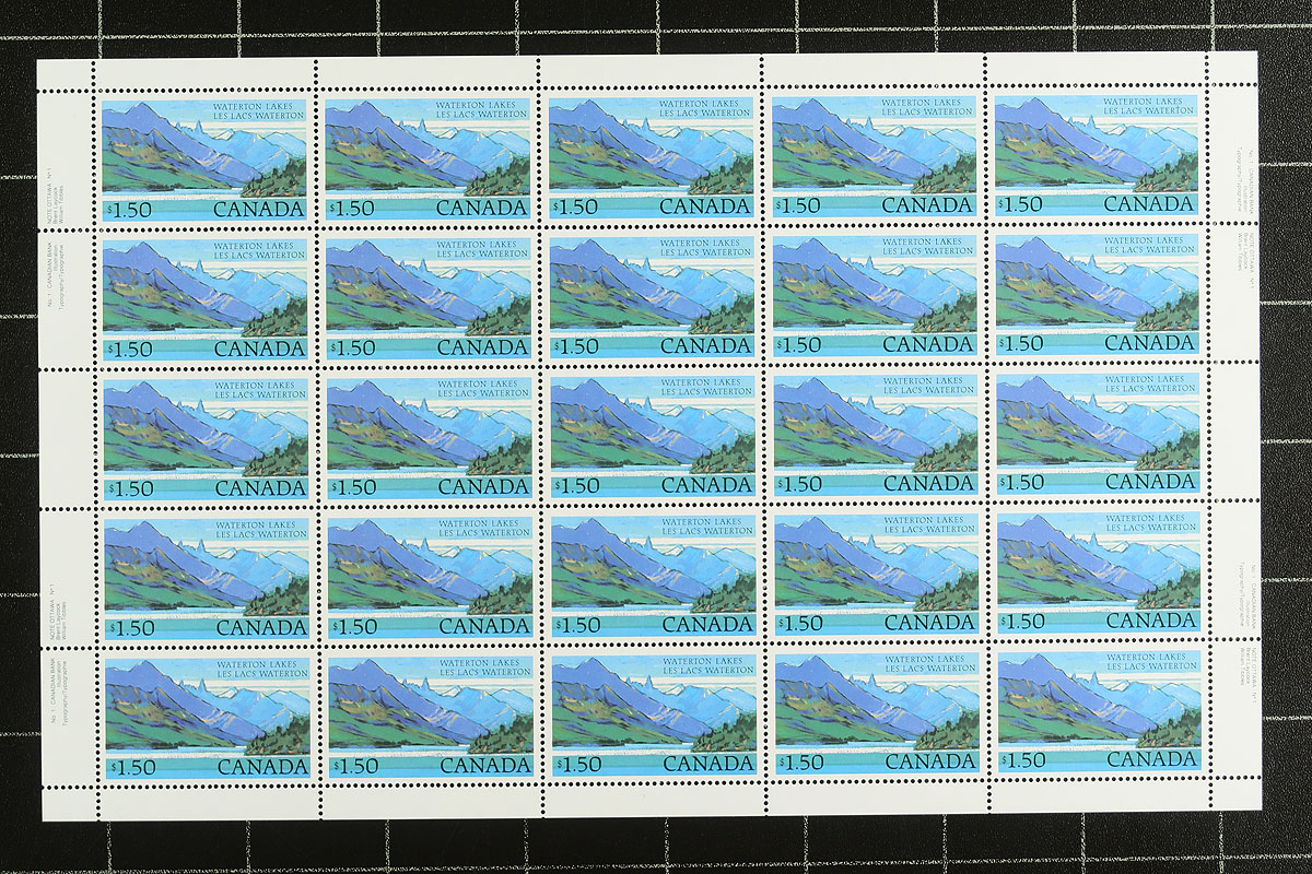 VF mint Never Hinged complete sheets (with inscription blocks on all four corners) of the $1.00 Glacier National Park, $1.50 Waterton Lakes and $2.00 Banff National Park from the 1982-1985 "Parks" high-value definitive series. Suffice to say, due to the high original cost, no many collectors put these full sheets away. Valued as a matched set of inscription blocks, plus 9 singles per sheet, but should be worth more! 2024 Unitrade =