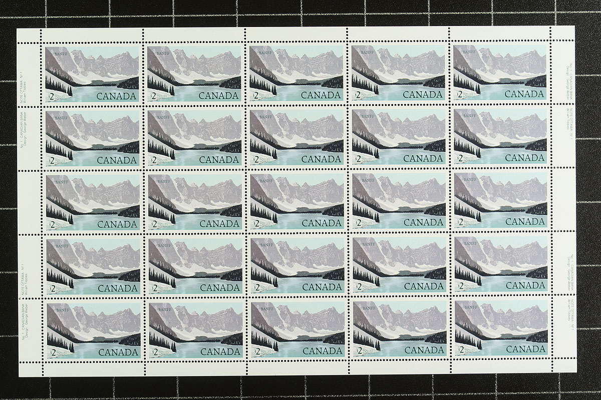 VF mint Never Hinged complete sheets (with inscription blocks on all four corners) of the $1.00 Glacier National Park, $1.50 Waterton Lakes and $2.00 Banff National Park from the 1982-1985 "Parks" high-value definitive series. Suffice to say, due to the high original cost, no many collectors put these full sheets away. Valued as a matched set of inscription blocks, plus 9 singles per sheet, but should be worth more! 2024 Unitrade =