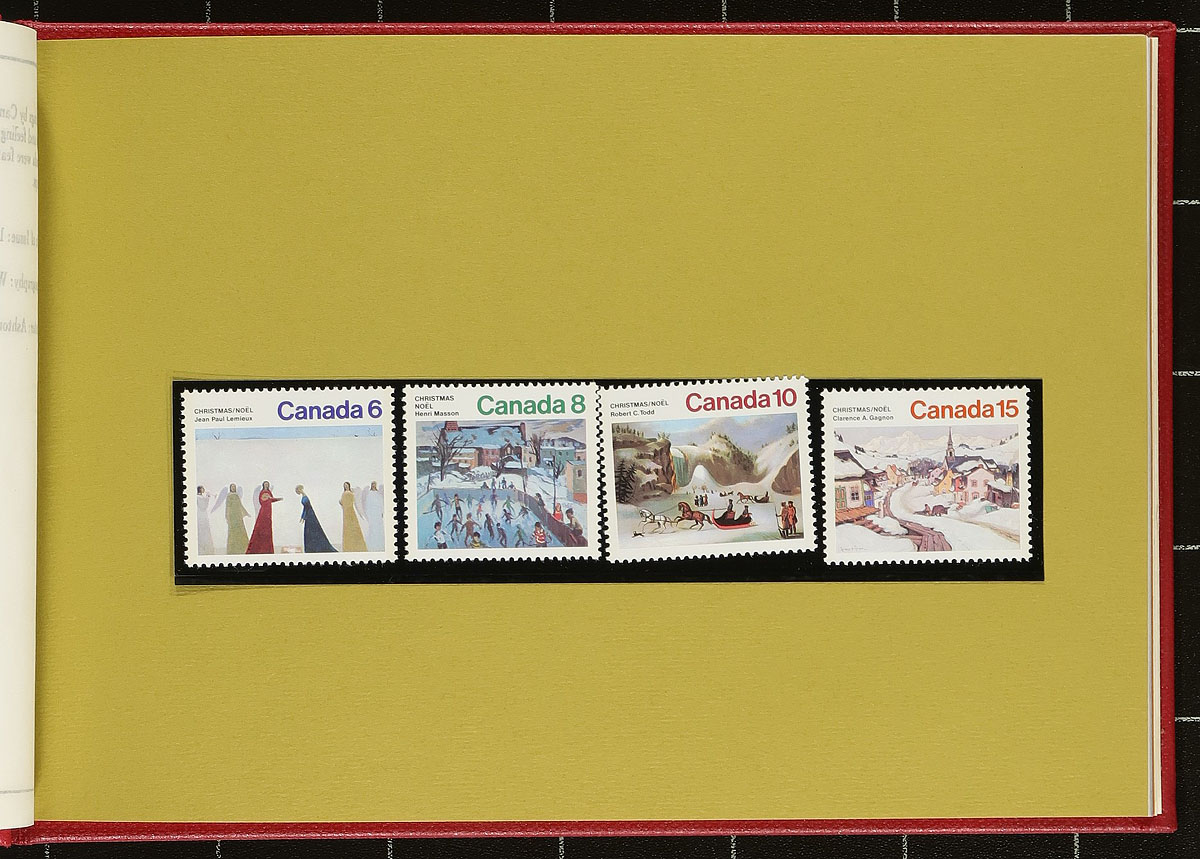Post Office Presentation Book 1973-1974. A deluxe hard-bound edition small format book, in dark red with Coat of Arms embossed on cover, with 11 different sets ranging from the 1973 RCMP issue, up to Christmas 1974. Title page reads (bilingually) "Presented with the compliments of the Canada Post Office" and hand-signed by "Murray E Featherstone, Manager Retail Division = Western Postal Region". A very unusual Post Office presentation booklet, the first we have seen! Estimate =