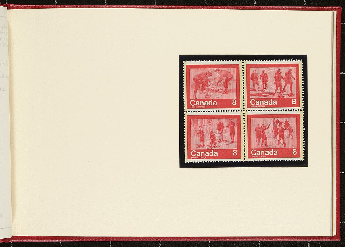 Post Office Presentation Book 1973-1974. A deluxe hard-bound edition small format book, in dark red with Coat of Arms embossed on cover, with 11 different sets ranging from the 1973 RCMP issue, up to Christmas 1974. Title page reads (bilingually) "Presented with the compliments of the Canada Post Office" and hand-signed by "Murray E Featherstone, Manager Retail Division = Western Postal Region". A very unusual Post Office presentation booklet, the first we have seen! Estimate =