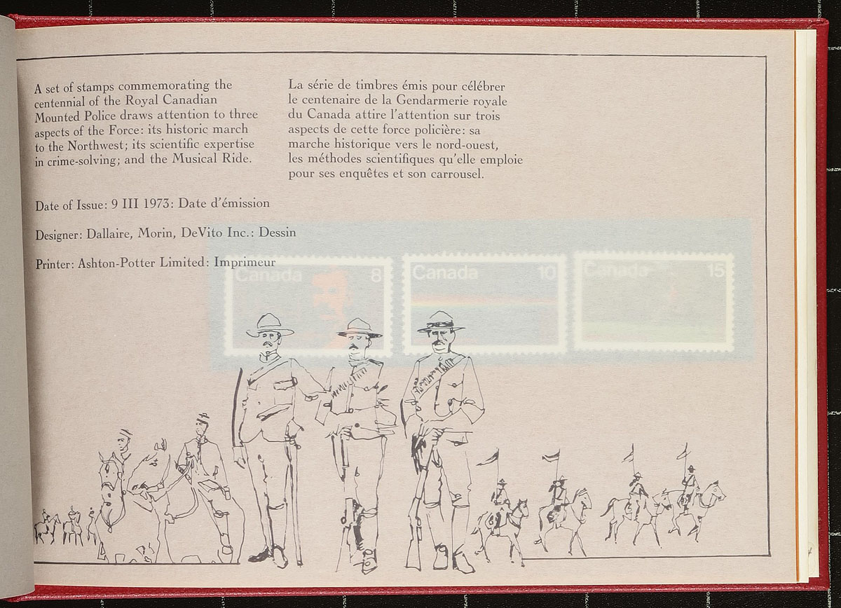 Post Office Presentation Book 1973-1974. A deluxe hard-bound edition small format book, in dark red with Coat of Arms embossed on cover, with 11 different sets ranging from the 1973 RCMP issue, up to Christmas 1974. Title page reads (bilingually) "Presented with the compliments of the Canada Post Office" and hand-signed by "Murray E Featherstone, Manager Retail Division = Western Postal Region". A very unusual Post Office presentation booklet, the first we have seen! Estimate =