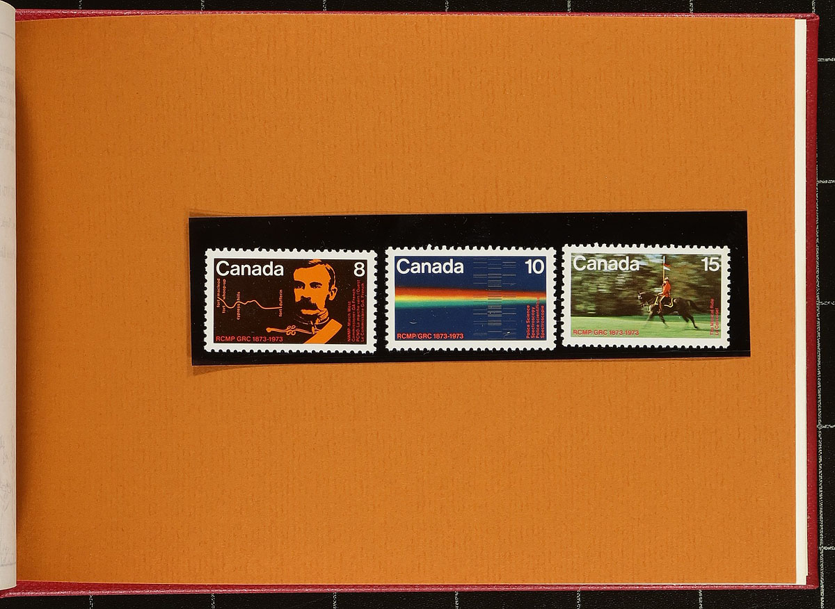 Post Office Presentation Book 1973-1974. A deluxe hard-bound edition small format book, in dark red with Coat of Arms embossed on cover, with 11 different sets ranging from the 1973 RCMP issue, up to Christmas 1974. Title page reads (bilingually) "Presented with the compliments of the Canada Post Office" and hand-signed by "Murray E Featherstone, Manager Retail Division = Western Postal Region". A very unusual Post Office presentation booklet, the first we have seen! Estimate =