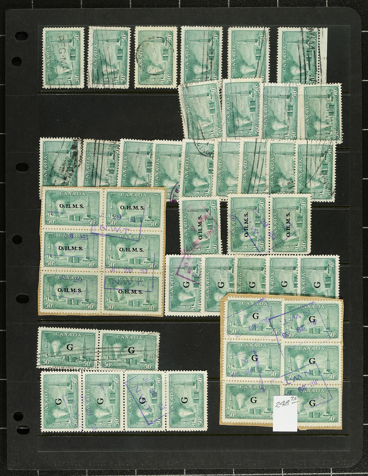 An "odd ball" assembly of "back of the book" plus 1950's high values and other "odds" that did not fit anywhere else (private perfins, consular service stamps, postmarks etc). Some of the highlights include #302 ($1.00 Fisheries) used x30, OHMS perfins, "G" and "O.H.M.S." officials (including high values), multiple 50c Oil Wells (including NWT postmarks) etc. All arranged (somewhat haphazardly) on stockpages. Estimate =