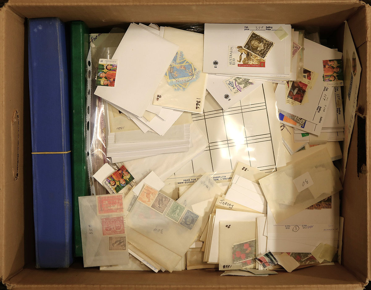 Mystery carton full of thousands and thousands of worldwide stamps in a variety of formats including albums, stock pages, album pages, 102 cards, glassines, and more. A very quick check indicated material ranging from the 1890s to modern day, with representation from Europe, North and South America, and surely more. A fun project for the worldwide collector. Estimate =