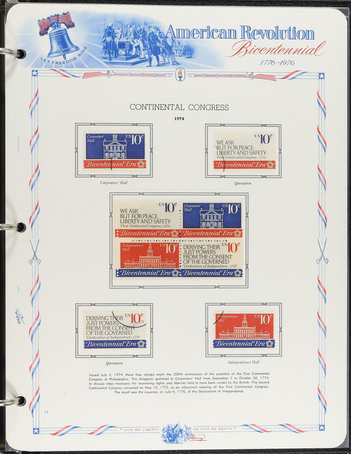 Accumulation of roughly 20 different United States Topical and Thematic Collections filling a a bankers box, including The American Revolution Stamp Album in two volumes, The Bi-Centennial collection in two volumes, several folios and much more. Just a few of the subjects include Presidents, nature, space and more. Estimate =
