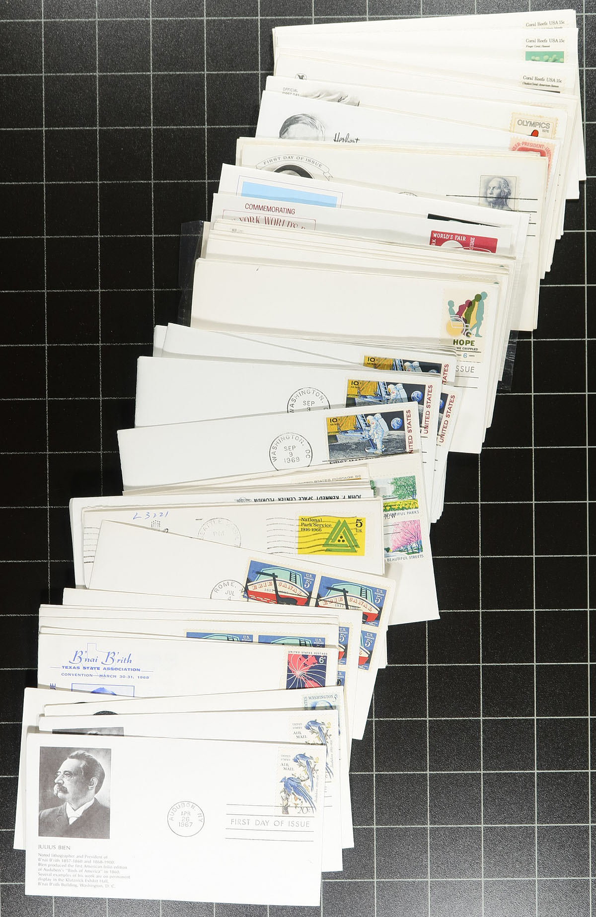 Accumulation of several hundred United States first day covers filling a box, 1930's-1990's, noting singles, pairs, blocks, coil pairs, booklet panes, and sets frankings. We note almost all the covers have private made cachets noting Fleetwood and Art Craft, along with a few "Colorado Silk" cachets, and a few others. Also includes a few event covers and space related material. A nice lot for the cover, topical, and thematic collector. Overall fine to very fine. Estimate =