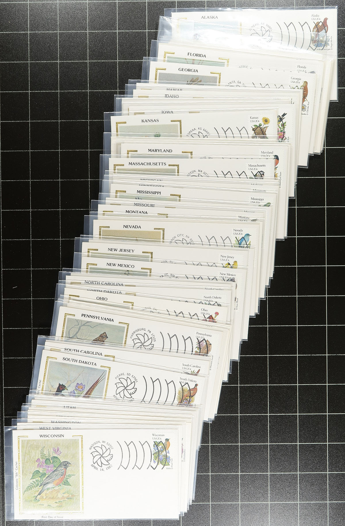 Accumulation of several hundred United States first day covers filling a box, 1930's-1990's, noting singles, pairs, blocks, coil pairs, booklet panes, and sets frankings. We note almost all the covers have private made cachets noting Fleetwood and Art Craft, along with a few "Colorado Silk" cachets, and a few others. Also includes a few event covers and space related material. A nice lot for the cover, topical, and thematic collector. Overall fine to very fine. Estimate =