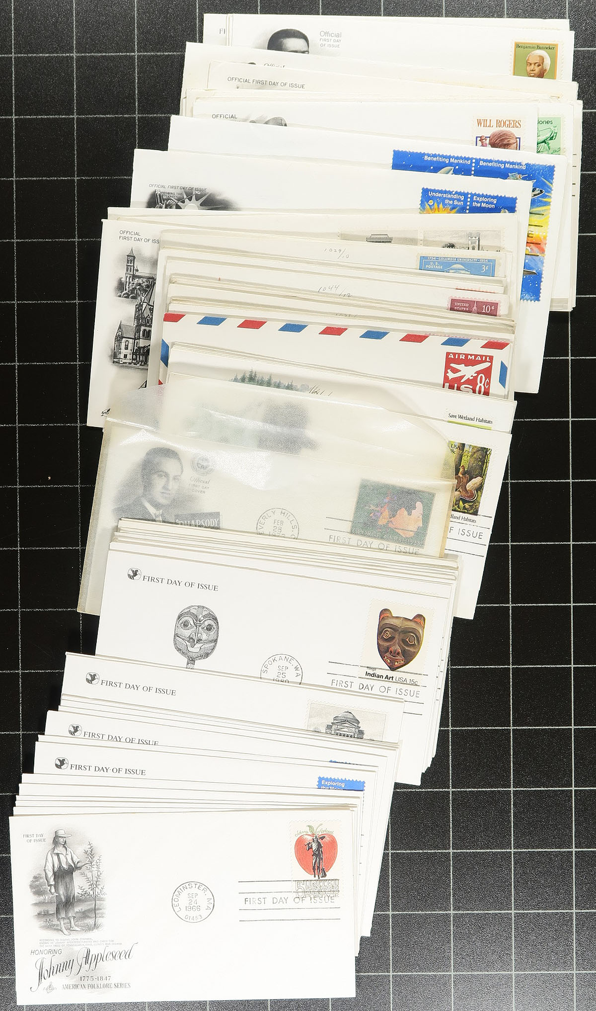 Accumulation of several hundred United States first day covers filling a box, 1930's-1990's, noting singles, pairs, blocks, coil pairs, booklet panes, and sets frankings. We note almost all the covers have private made cachets noting Fleetwood and Art Craft, along with a few "Colorado Silk" cachets, and a few others. Also includes a few event covers and space related material. A nice lot for the cover, topical, and thematic collector. Overall fine to very fine. Estimate =