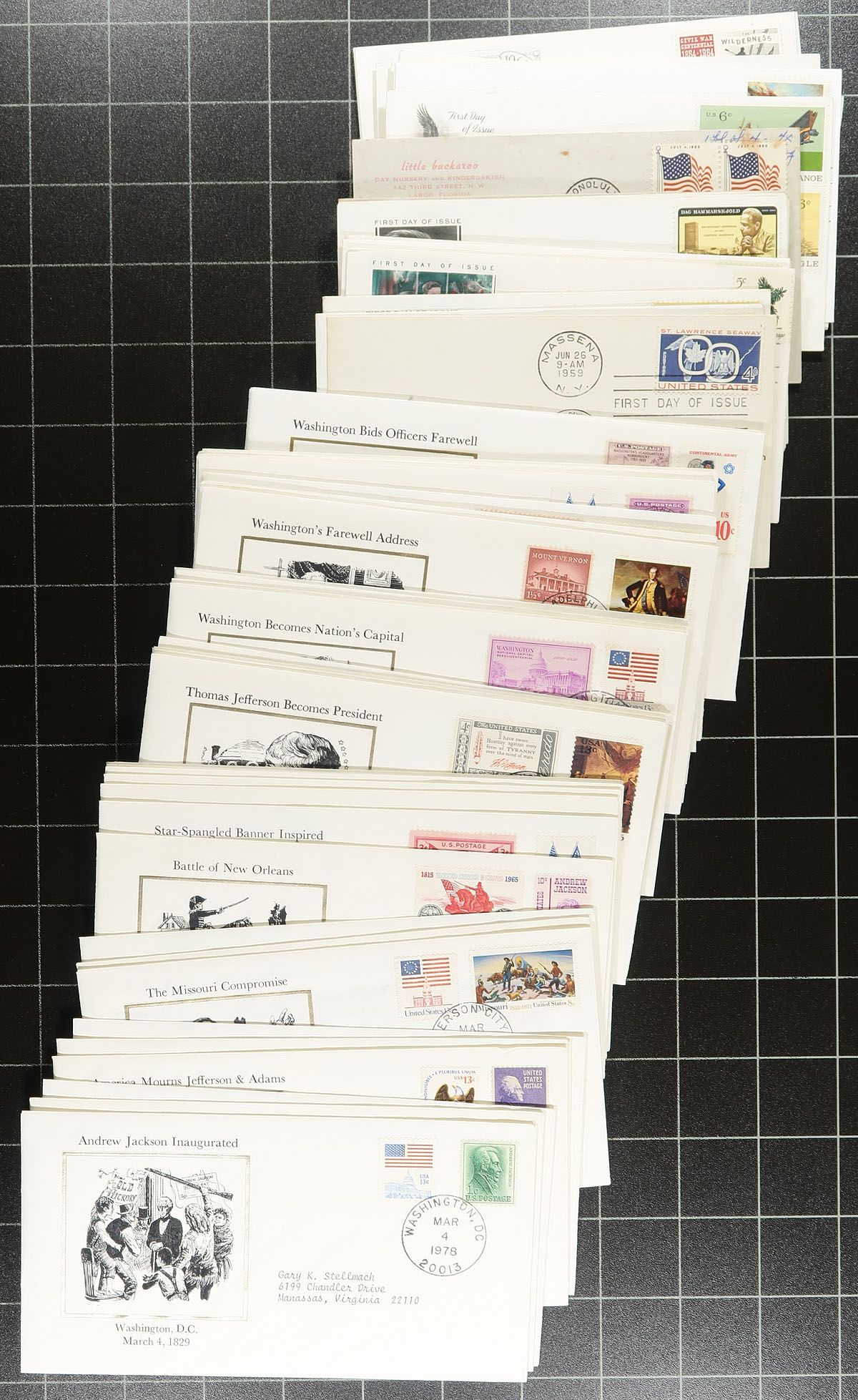 Accumulation of several hundred United States first day covers filling a box, 1930's-1990's, noting singles, pairs, blocks, coil pairs, booklet panes, and sets frankings. We note almost all the covers have private made cachets noting Fleetwood and Art Craft, along with a few "Colorado Silk" cachets, and a few others. Also includes a few event covers and space related material. A nice lot for the cover, topical, and thematic collector. Overall fine to very fine. Estimate =