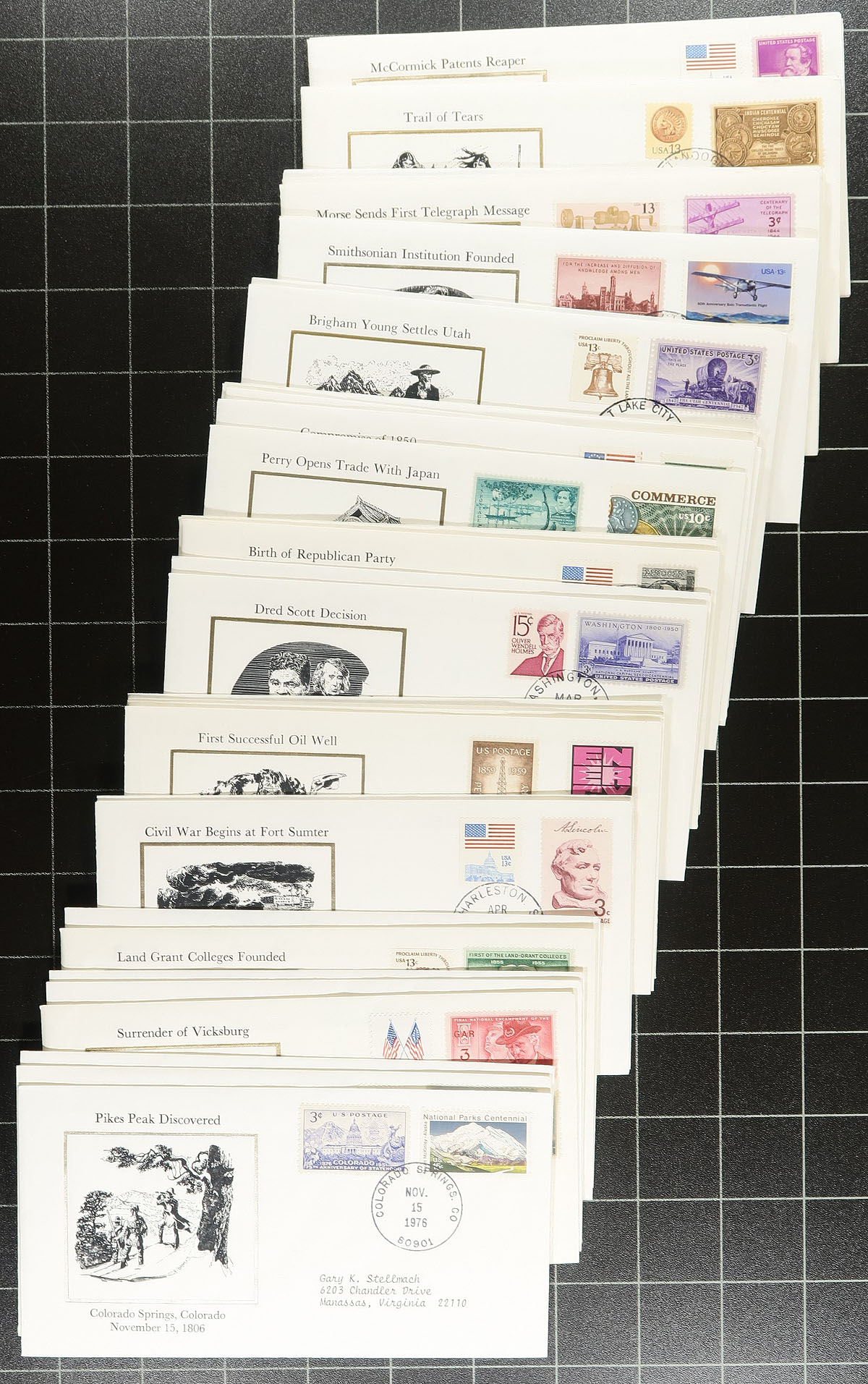 Accumulation of several hundred United States first day covers filling a box, 1930's-1990's, noting singles, pairs, blocks, coil pairs, booklet panes, and sets frankings. We note almost all the covers have private made cachets noting Fleetwood and Art Craft, along with a few "Colorado Silk" cachets, and a few others. Also includes a few event covers and space related material. A nice lot for the cover, topical, and thematic collector. Overall fine to very fine. Estimate =