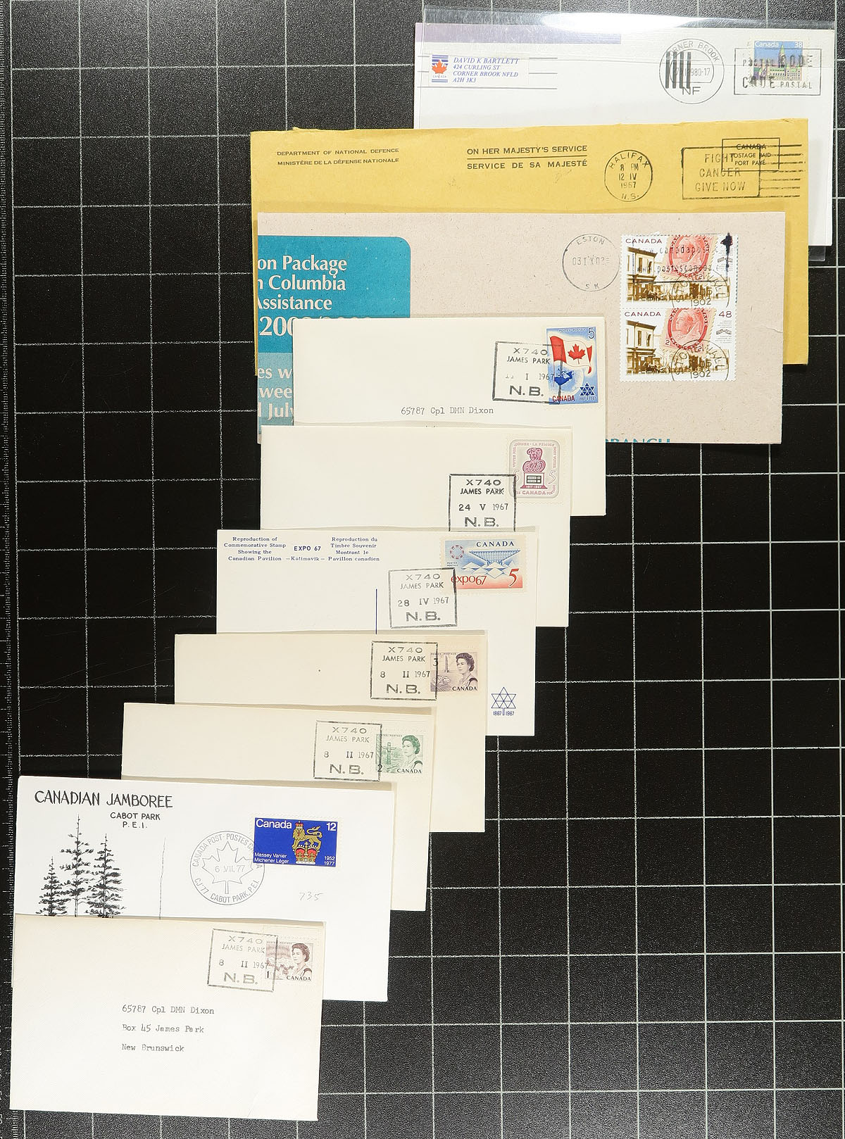 Group of roughly 450 covers all with Maritime postmarks, with better representation from Nova Scotia, New Brunswick, and some Newfoundland. Almost all of the covers are commercial in nature, generally from the 1960's to the 1970's, with some material on either side of the given range. We note some corner advertising envelopes, with postmark interest including cds, duplex, machine, slogan, POCON, and a few other types. We estimate a few hundred different town are represented including Portage, Sheet Harbour, Tangier, Robertville, Englee, Seal Cove White Bay, Tusket, and much more. A nice lot for the postmark hunter, overall fine to very fine. Estimate =
