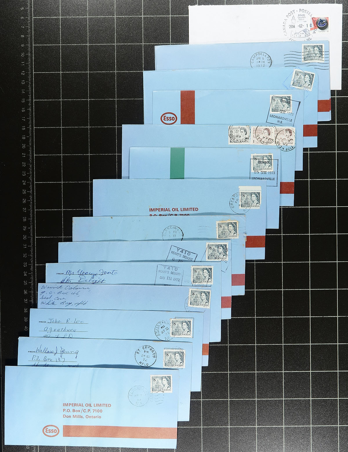 Group of roughly 450 covers all with Maritime postmarks, with better representation from Nova Scotia, New Brunswick, and some Newfoundland. Almost all of the covers are commercial in nature, generally from the 1960's to the 1970's, with some material on either side of the given range. We note some corner advertising envelopes, with postmark interest including cds, duplex, machine, slogan, POCON, and a few other types. We estimate a few hundred different town are represented including Portage, Sheet Harbour, Tangier, Robertville, Englee, Seal Cove White Bay, Tusket, and much more. A nice lot for the postmark hunter, overall fine to very fine. Estimate =