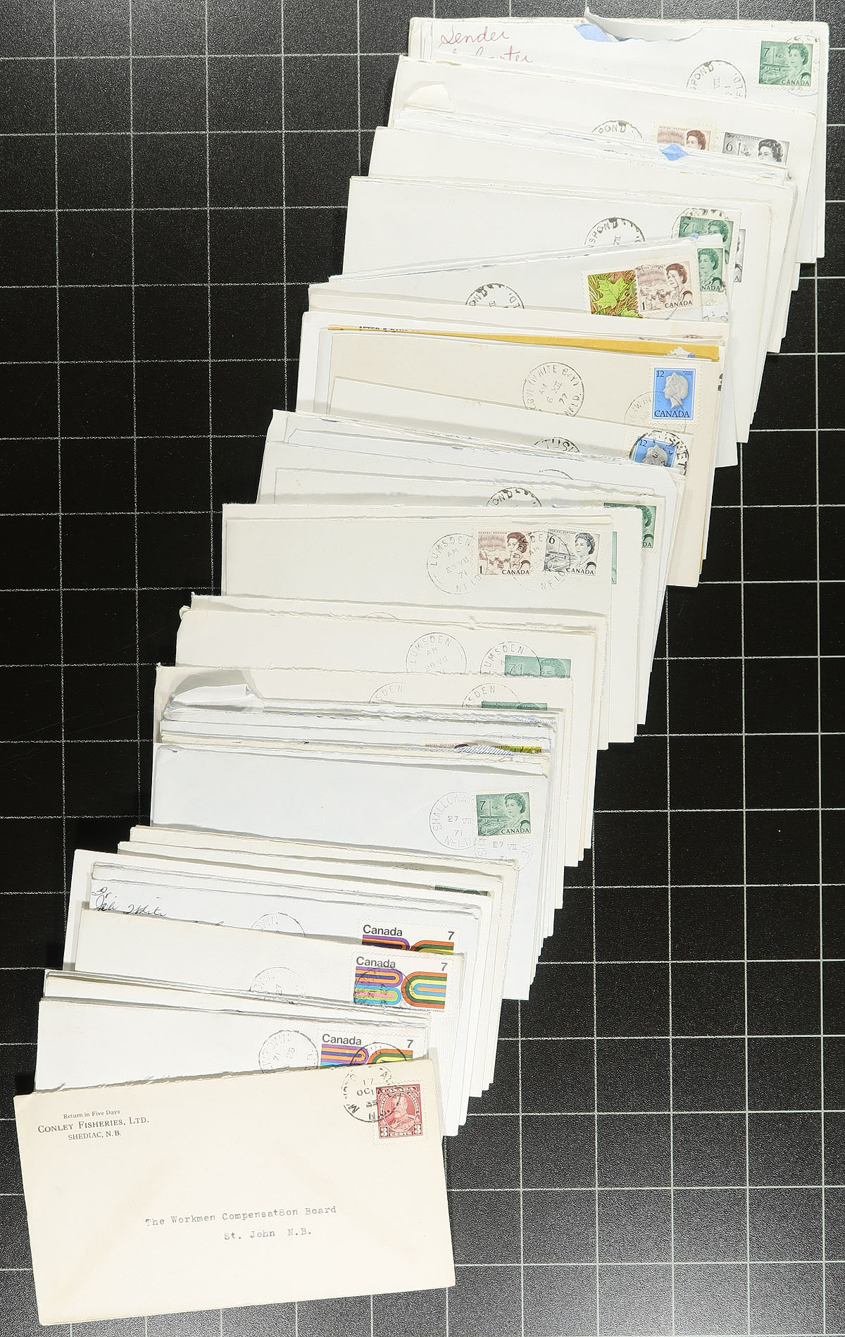 Group of roughly 450 covers all with Maritime postmarks, with better representation from Nova Scotia, New Brunswick, and some Newfoundland. Almost all of the covers are commercial in nature, generally from the 1960's to the 1970's, with some material on either side of the given range. We note some corner advertising envelopes, with postmark interest including cds, duplex, machine, slogan, POCON, and a few other types. We estimate a few hundred different town are represented including Portage, Sheet Harbour, Tangier, Robertville, Englee, Seal Cove White Bay, Tusket, and much more. A nice lot for the postmark hunter, overall fine to very fine. Estimate =