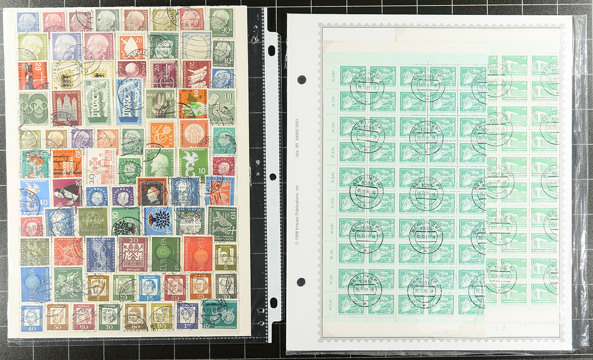 Accumulation of used Germany, 1875-2006, containing over 3,000 stamps in a stockbook and roughly 20 stock or album pages. We note the majority of material is post 1940, with representation from Germany, DDR, and Berlin, including a stockbook of DDR containing over 600 stamps on piece with pictorial cancels ranging from 1955 to 1975. A spot check indicated a few singles, sets, and partial sets, cataloguing $10 and up, with owner's 2018 Scott value for the lot totaling US$1,694.00. Postmark interest includes various cds and mostly bridge types, including several "socked on the nose" town cancels. A nice lot for the Germany or worldwide collector, overall fine to very fine. Estimate =