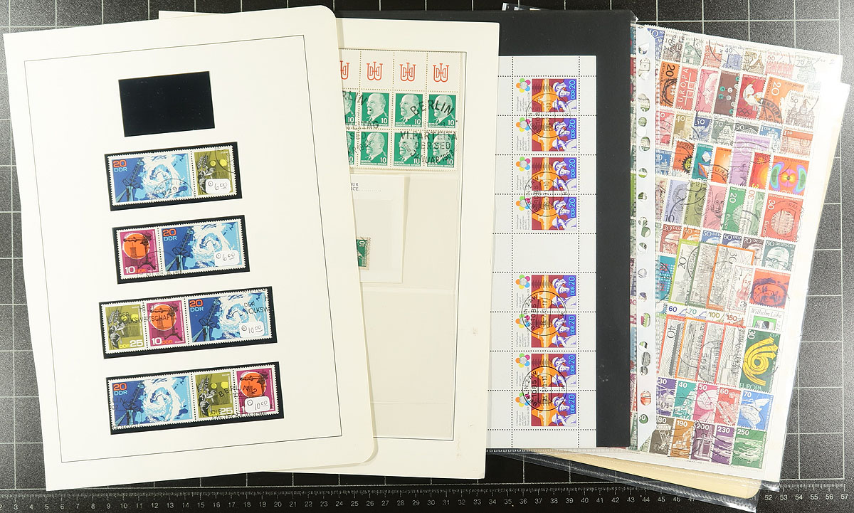 Accumulation of used Germany, 1875-2006, containing over 3,000 stamps in a stockbook and roughly 20 stock or album pages. We note the majority of material is post 1940, with representation from Germany, DDR, and Berlin, including a stockbook of DDR containing over 600 stamps on piece with pictorial cancels ranging from 1955 to 1975. A spot check indicated a few singles, sets, and partial sets, cataloguing $10 and up, with owner's 2018 Scott value for the lot totaling US$1,694.00. Postmark interest includes various cds and mostly bridge types, including several "socked on the nose" town cancels. A nice lot for the Germany or worldwide collector, overall fine to very fine. Estimate =