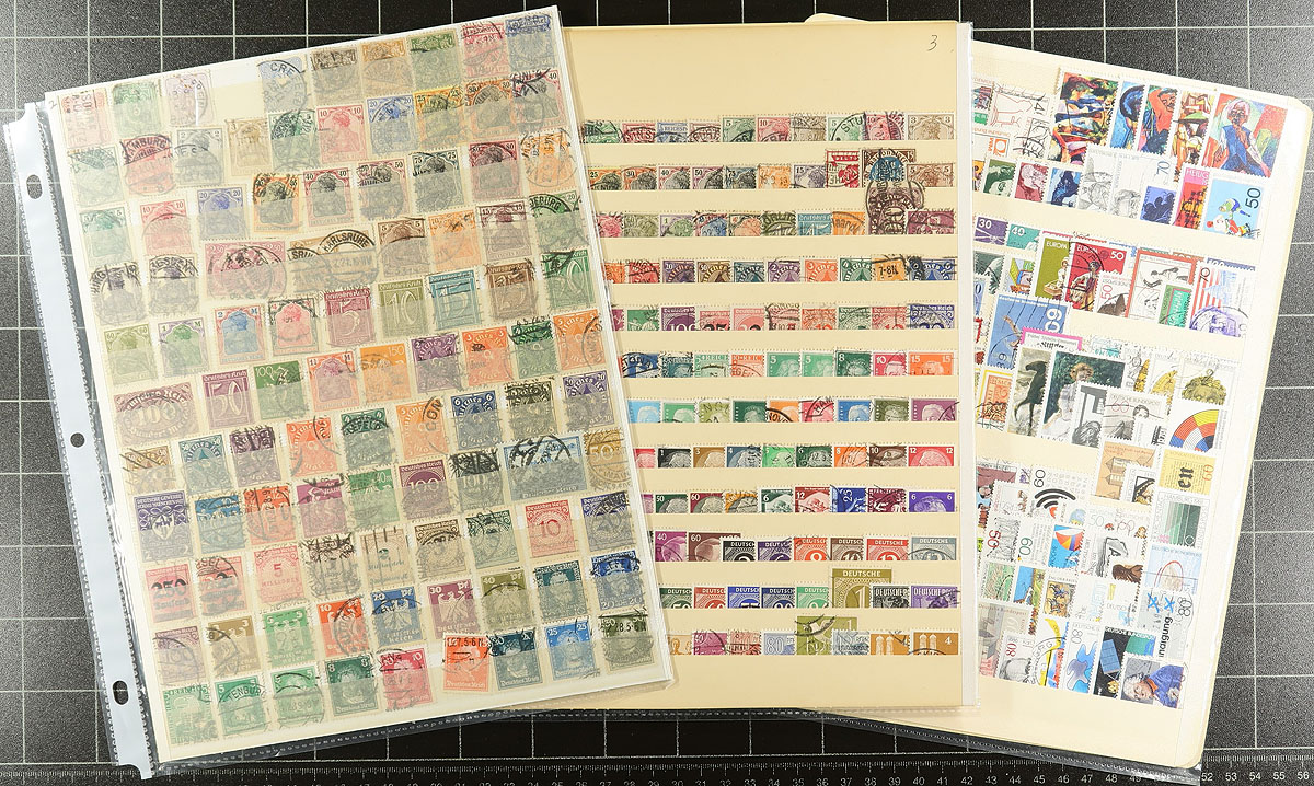 Accumulation of used Germany, 1875-2006, containing over 3,000 stamps in a stockbook and roughly 20 stock or album pages. We note the majority of material is post 1940, with representation from Germany, DDR, and Berlin, including a stockbook of DDR containing over 600 stamps on piece with pictorial cancels ranging from 1955 to 1975. A spot check indicated a few singles, sets, and partial sets, cataloguing $10 and up, with owner's 2018 Scott value for the lot totaling US$1,694.00. Postmark interest includes various cds and mostly bridge types, including several "socked on the nose" town cancels. A nice lot for the Germany or worldwide collector, overall fine to very fine. Estimate =