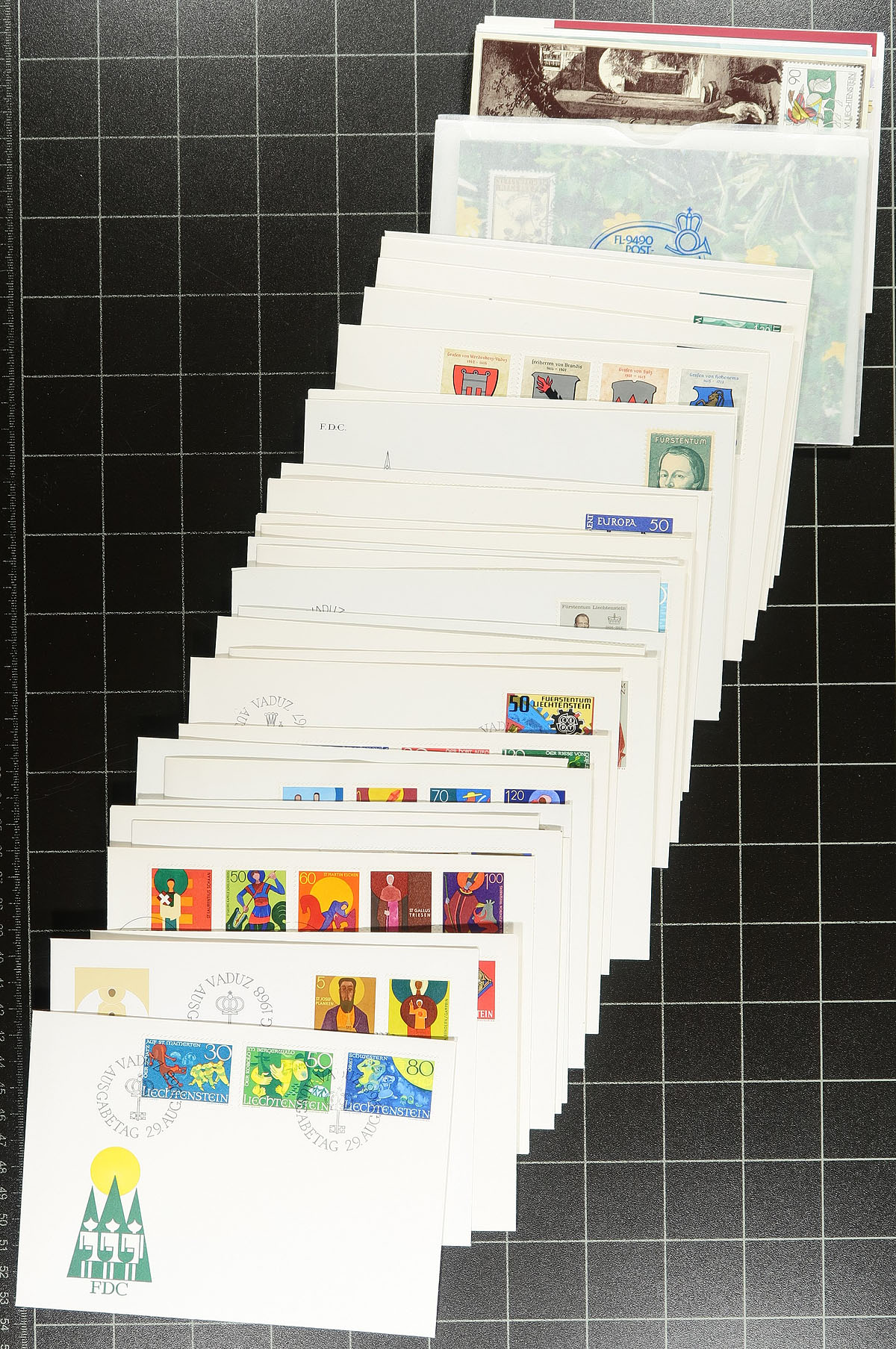 Lovely group of Liechtenstein first day covers and maximum card sets, with roughly 250 items generally ranging from the 1960's to the 1990's. We note singles, sets, and souvenir sheet frankings, almost all with suitable pictorial cancels. A nice lot for thematic and topical collectors as we encountered various subjects including Olympics, music, horses, transportation, and much more. A nice group from a desirable collecting country. Estimate =