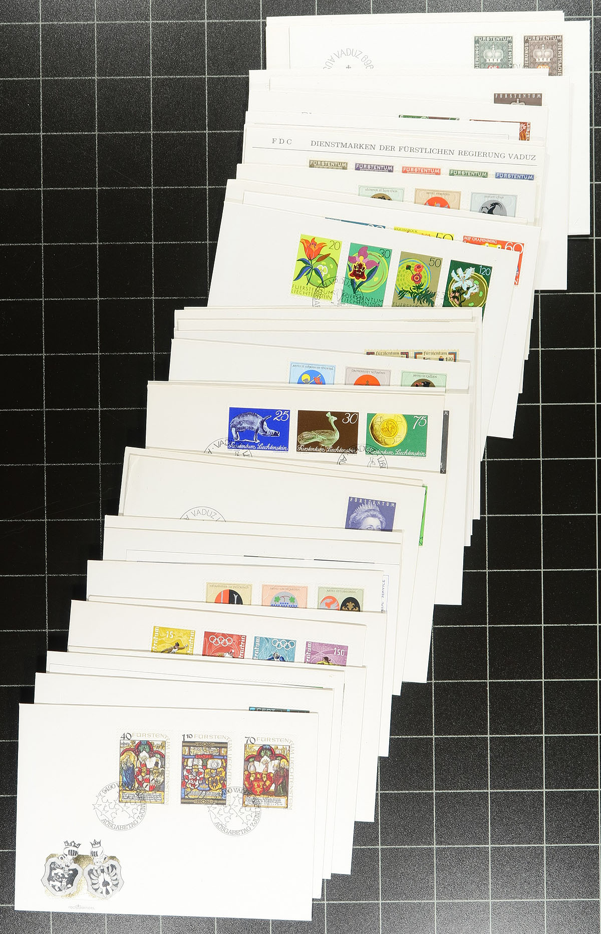 Lovely group of Liechtenstein first day covers and maximum card sets, with roughly 250 items generally ranging from the 1960's to the 1990's. We note singles, sets, and souvenir sheet frankings, almost all with suitable pictorial cancels. A nice lot for thematic and topical collectors as we encountered various subjects including Olympics, music, horses, transportation, and much more. A nice group from a desirable collecting country. Estimate =