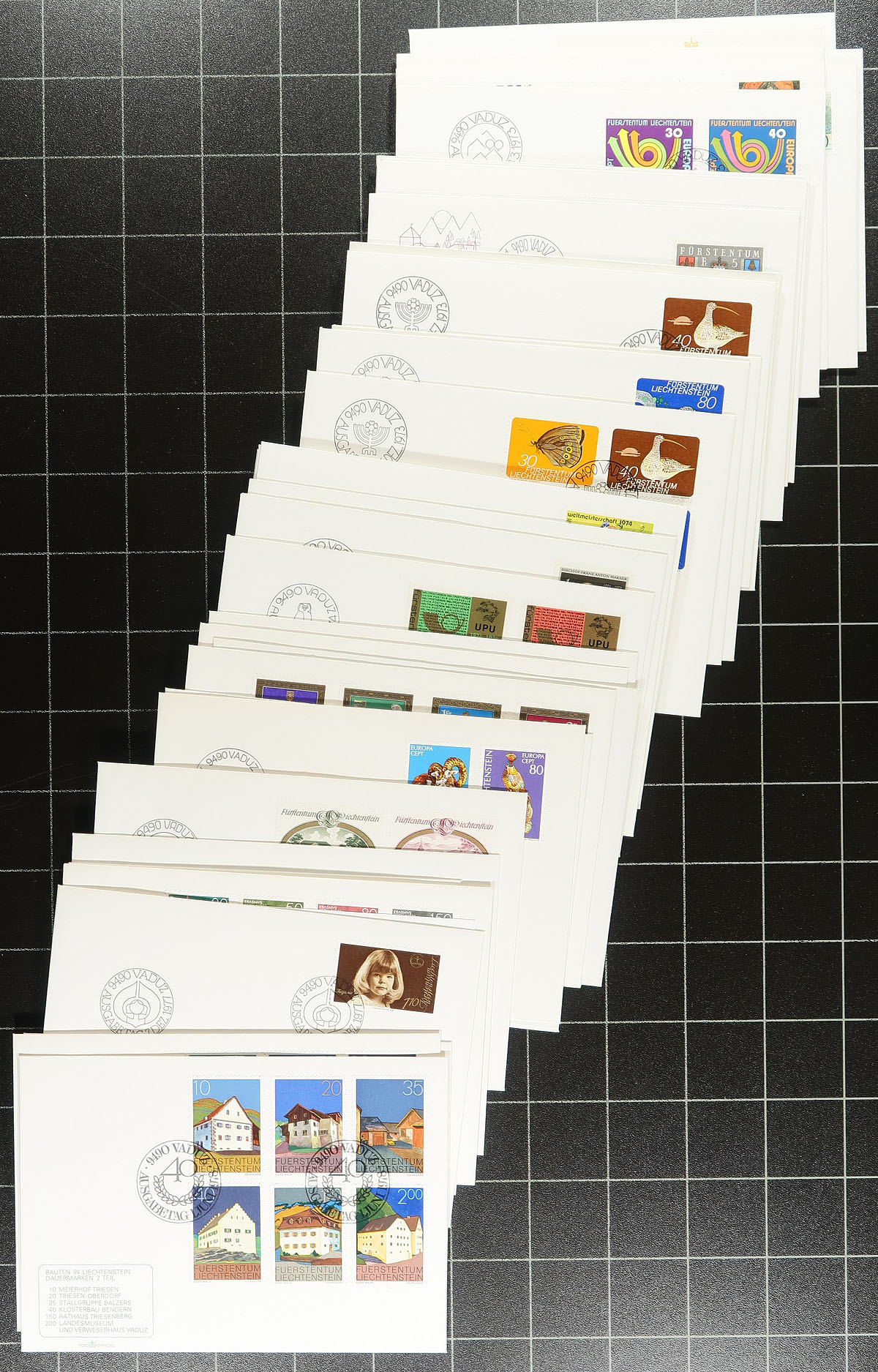 Lovely group of Liechtenstein first day covers and maximum card sets, with roughly 250 items generally ranging from the 1960's to the 1990's. We note singles, sets, and souvenir sheet frankings, almost all with suitable pictorial cancels. A nice lot for thematic and topical collectors as we encountered various subjects including Olympics, music, horses, transportation, and much more. A nice group from a desirable collecting country. Estimate =