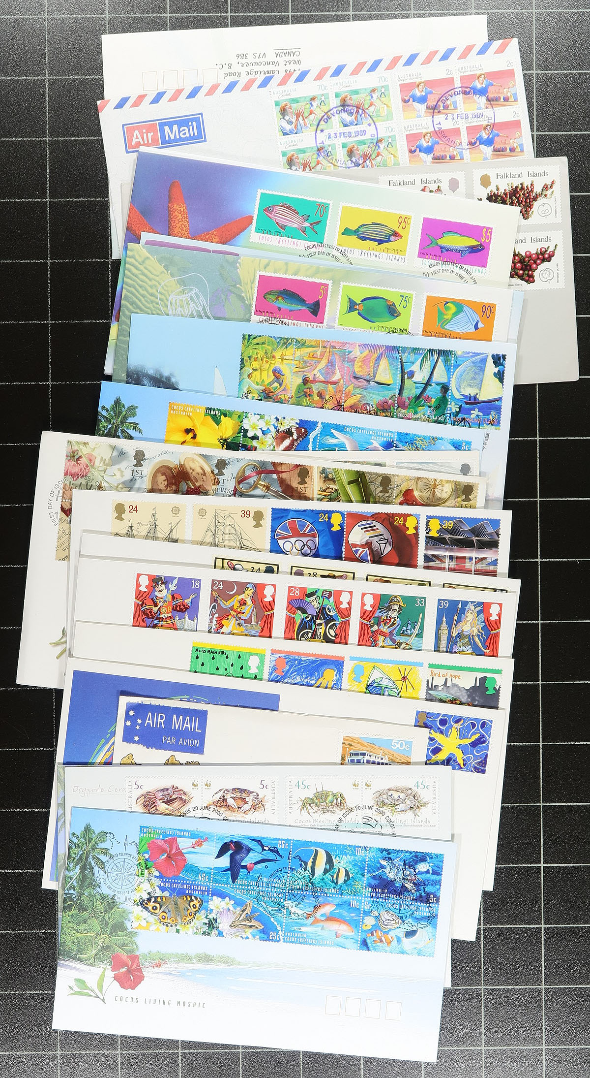 Group of roughly 225 British Commonwealth first day covers, generally ranging from the 1970's to the early 2000's, with better representation from Australia, New Zealand and area, Great Britain, British Virgin Islands, and a few others. We note singles, several sets, souvenir sheets, gutter blocks (roughly 30 from Australia with Tasmania postmarks), and high denomination frankings. A nice group of covers for collectors and dealers alike. Estimate =