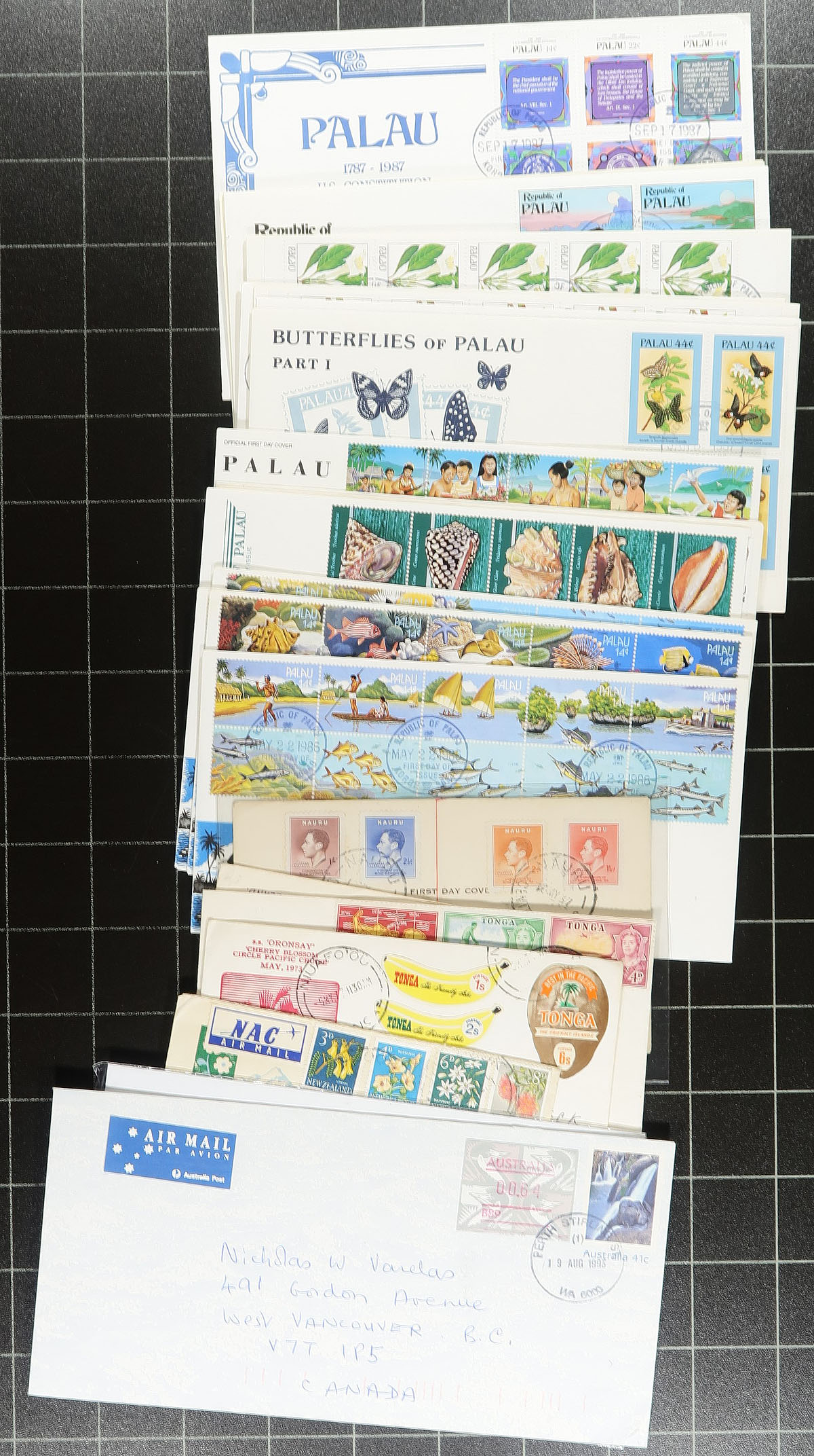 Group of roughly 225 British Commonwealth first day covers, generally ranging from the 1970's to the early 2000's, with better representation from Australia, New Zealand and area, Great Britain, British Virgin Islands, and a few others. We note singles, several sets, souvenir sheets, gutter blocks (roughly 30 from Australia with Tasmania postmarks), and high denomination frankings. A nice group of covers for collectors and dealers alike. Estimate =