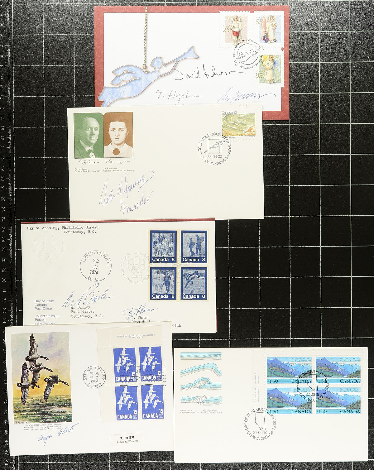 First Day Covers. Nice clean group of Canada first day covers, 1940's-2000's, containing roughly 500 covers neatly arranged in a small plastic tub. The lot consists of roughly 250 pre-1972 covers, many having private cachets (noting NR, Art Craft, and Rosecraft), with the rest being post-1972, noting singles, sets, plate block, and high denomination frankings. We also saw a few signed first day covers from a few notables. A nice lot for collectors and dealers alike, overall fine to very fine. Estimate =