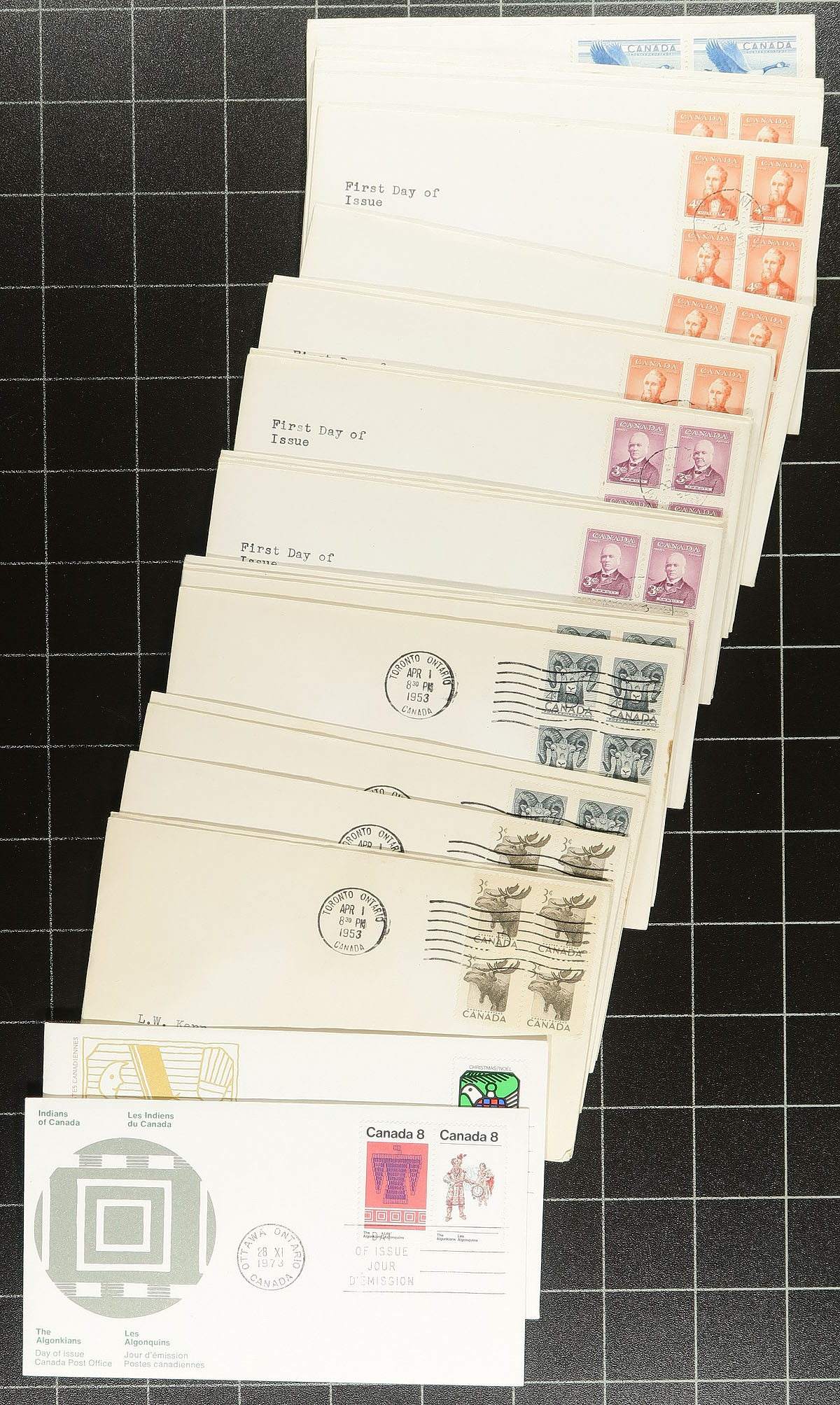 First Day Covers. Nice clean group of Canada first day covers, 1940's-2000's, containing roughly 500 covers neatly arranged in a small plastic tub. The lot consists of roughly 250 pre-1972 covers, many having private cachets (noting NR, Art Craft, and Rosecraft), with the rest being post-1972, noting singles, sets, plate block, and high denomination frankings. We also saw a few signed first day covers from a few notables. A nice lot for collectors and dealers alike, overall fine to very fine. Estimate =