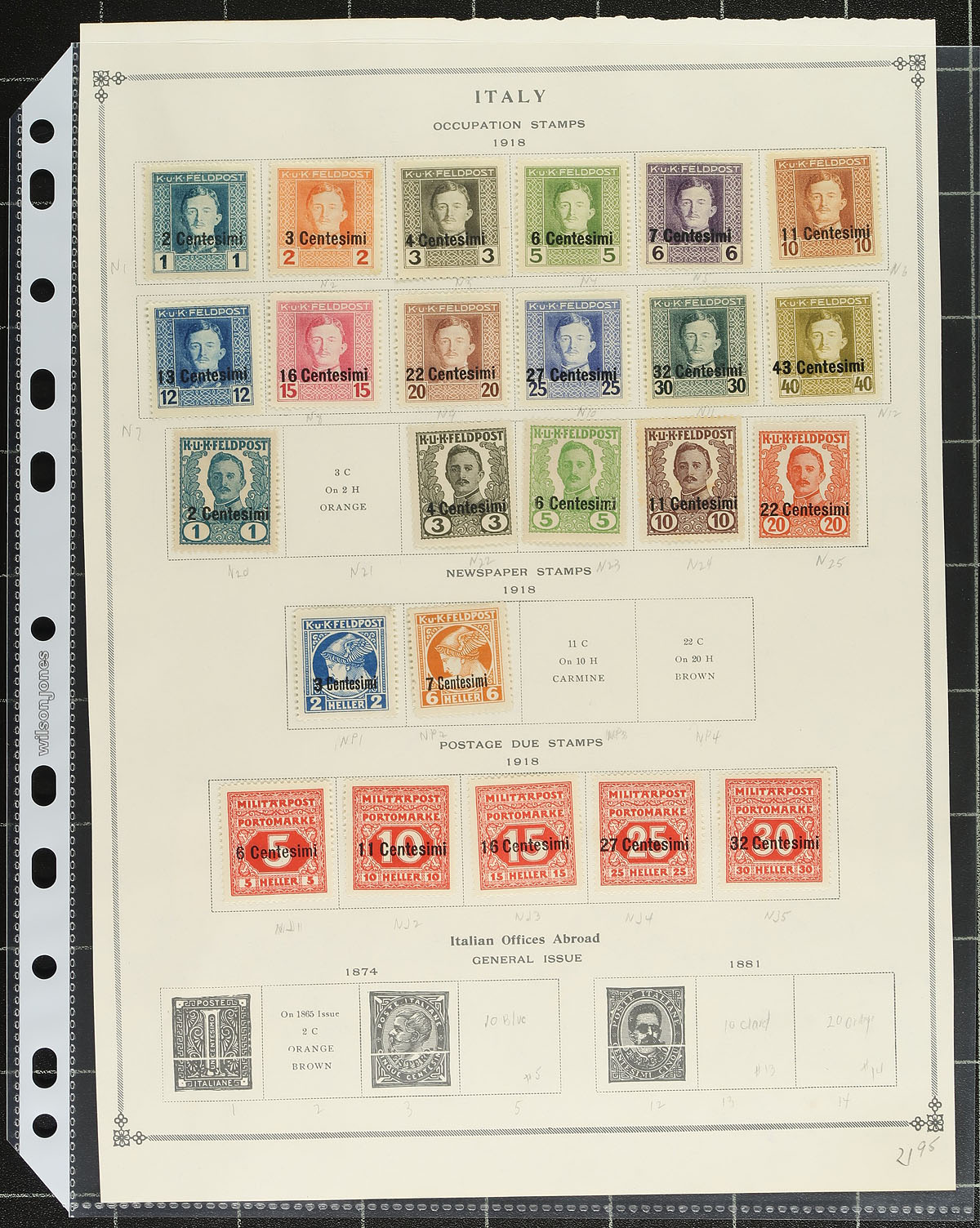 Collection of mint and used Italy, 1863-1959, containing several hundreds of stamps in roughly 60 album pages. The collection generally ranges from Scott #23/784, along with selections of back of the book issues, occupations and a few colonies. Owner's older catalogue value for the collection totals US$730.00, leaving better finds for the dedicated collector. We encountered a few faults with a few of the early stamps, with online photos showing a sampling. A nice starter collection for the worldwide or Italy collector. Estimate =