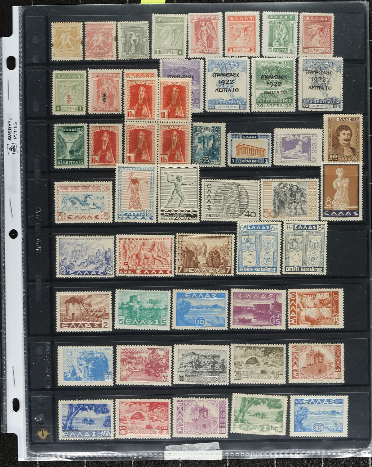 Collection of primarily mint Greece, 1880's-1960's, containing roughly 425 stamps in several mostly hingeless album pages and a few stock pages. The lot generally ranges from Scott #48/900, includes a decent selection of perforated and imperforated Hermes Heads, and back of the book issues. A cursory check indicated singles, sets, and partial sets cataloguing $10 and up including Scott #416-420 (nh, c.v. $125 total), leaving better finds to the dedicated collector. Owner's 2013 Scott catalogue value for the collection totals US$2,533.00 ($3419.55 CDN). A nice lot for collectors and dealers alike, with online photos showing a sampling. Estimate =