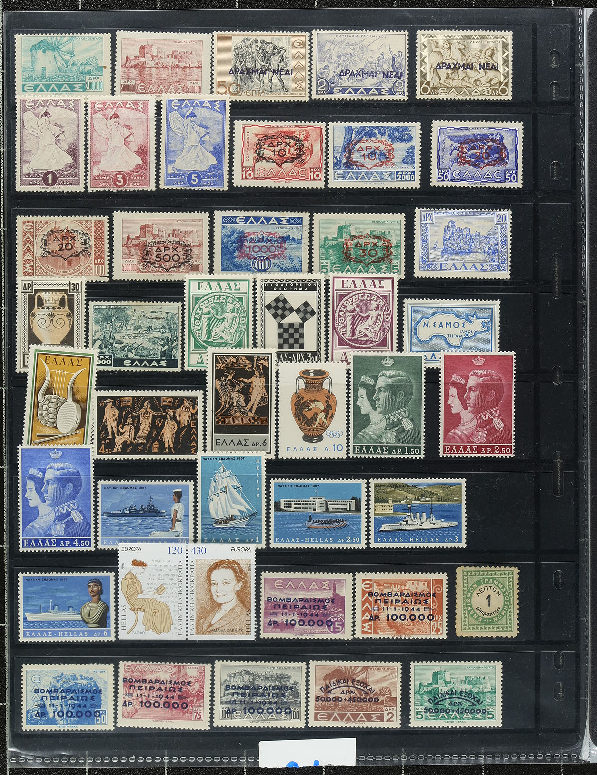 Collection of primarily mint Greece, 1880's-1960's, containing roughly 425 stamps in several mostly hingeless album pages and a few stock pages. The lot generally ranges from Scott #48/900, includes a decent selection of perforated and imperforated Hermes Heads, and back of the book issues. A cursory check indicated singles, sets, and partial sets cataloguing $10 and up including Scott #416-420 (nh, c.v. $125 total), leaving better finds to the dedicated collector. Owner's 2013 Scott catalogue value for the collection totals US$2,533.00 ($3419.55 CDN). A nice lot for collectors and dealers alike, with online photos showing a sampling. Estimate =