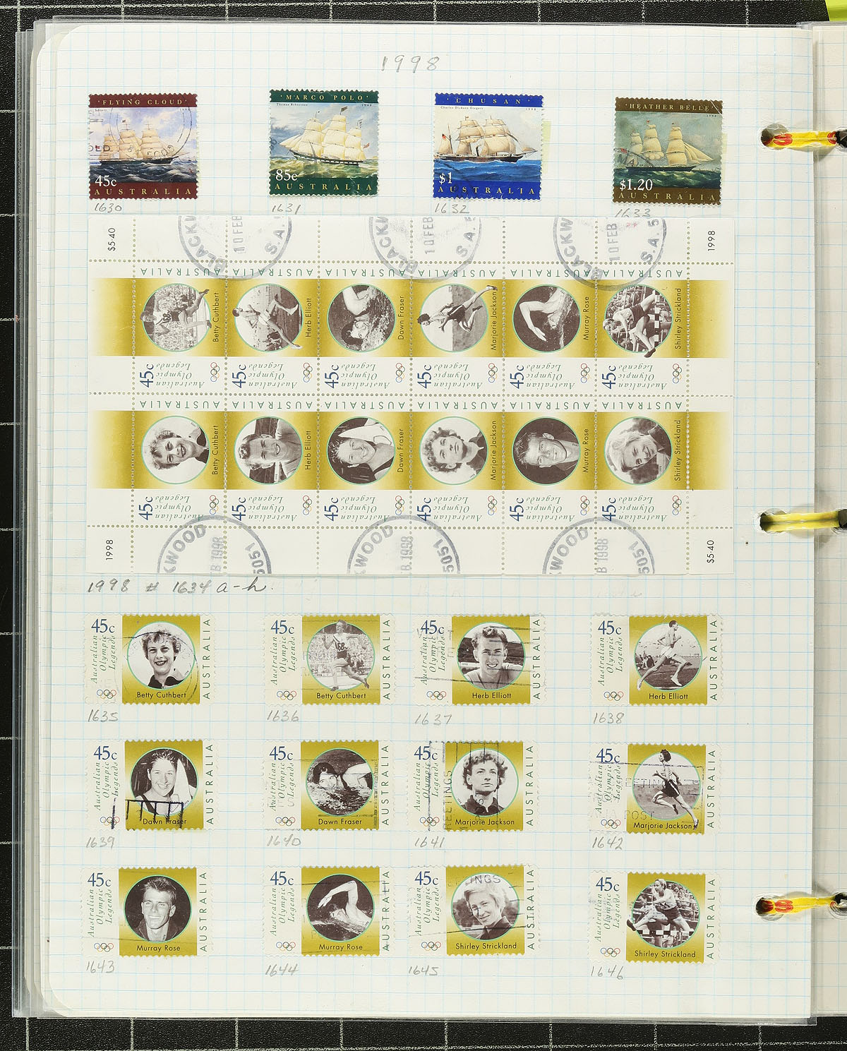 Nice collection of primarily used Australia, 1913-2001, containing a few thousand stamps on roughly 75 homemade and Minkus album pages. The collection generally ranges from Scott #1/1932, and includes a small selection of Kangaroos and KGV Heads, back of the book issues, including officials and postage dues, and much more. A cursory check indicated singles, sets, and partial sets cataloguing $10 and including J86-J95 (mh, c.v. $179 total), leaving other finds to collectors. A nice lot for the Australia collector, and should be continued until completion, overall fine to very fine. Owner's older 2013 Scott US$1,634.00 =