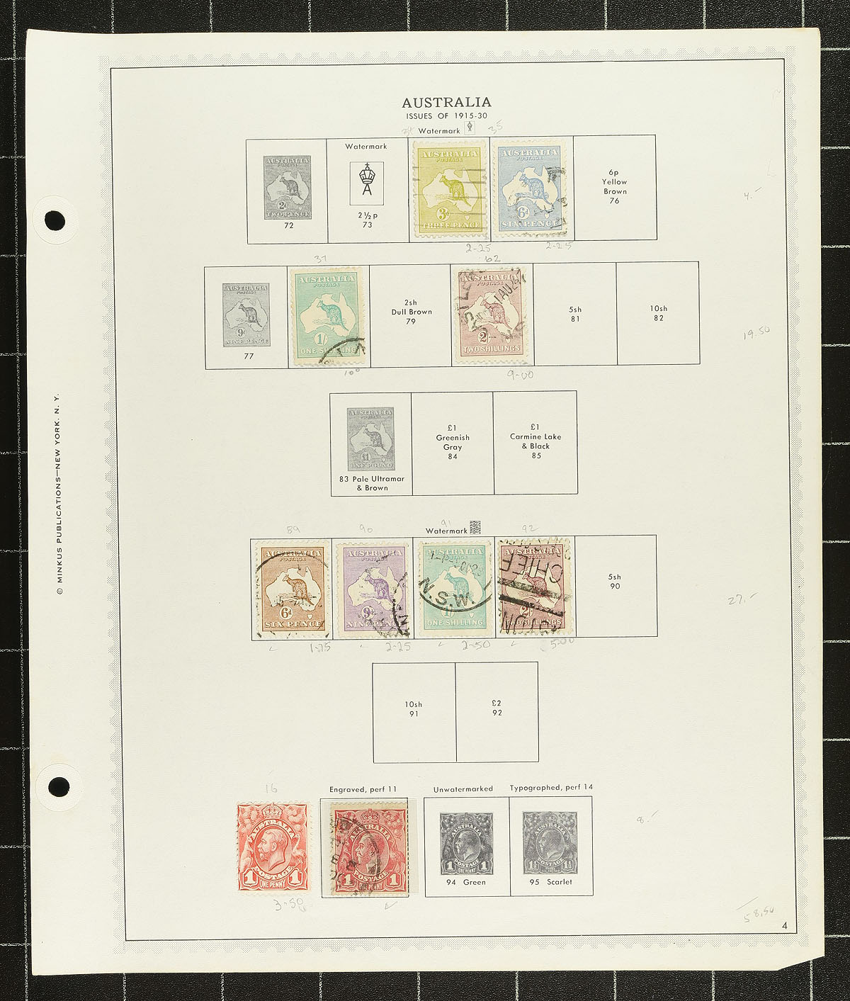 Nice collection of primarily used Australia, 1913-2001, containing a few thousand stamps on roughly 75 homemade and Minkus album pages. The collection generally ranges from Scott #1/1932, and includes a small selection of Kangaroos and KGV Heads, back of the book issues, including officials and postage dues, and much more. A cursory check indicated singles, sets, and partial sets cataloguing $10 and including J86-J95 (mh, c.v. $179 total), leaving other finds to collectors. A nice lot for the Australia collector, and should be continued until completion, overall fine to very fine. Owner's older 2013 Scott US$1,634.00 =