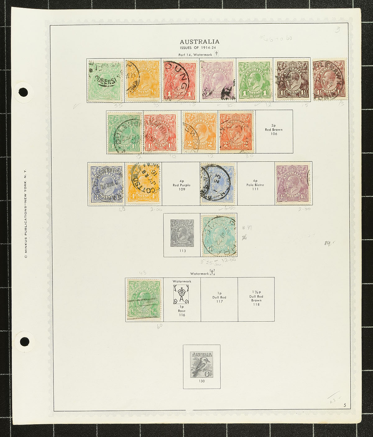 Nice collection of primarily used Australia, 1913-2001, containing a few thousand stamps on roughly 75 homemade and Minkus album pages. The collection generally ranges from Scott #1/1932, and includes a small selection of Kangaroos and KGV Heads, back of the book issues, including officials and postage dues, and much more. A cursory check indicated singles, sets, and partial sets cataloguing $10 and including J86-J95 (mh, c.v. $179 total), leaving other finds to collectors. A nice lot for the Australia collector, and should be continued until completion, overall fine to very fine. Owner's older 2013 Scott US$1,634.00 =