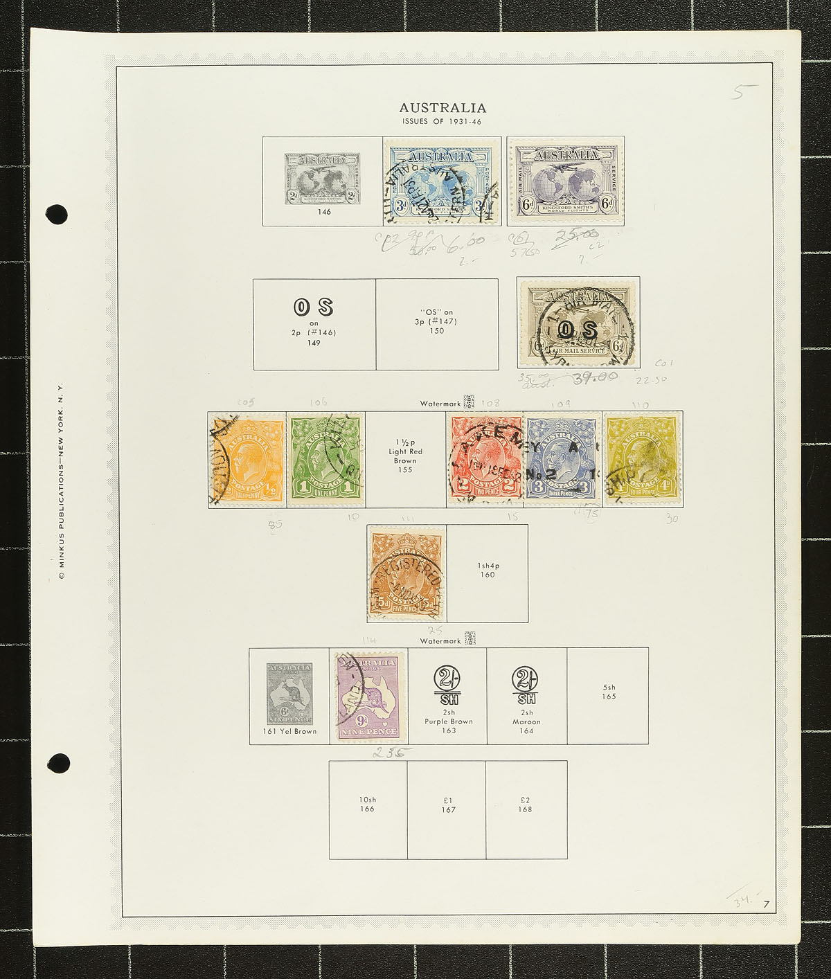 Nice collection of primarily used Australia, 1913-2001, containing a few thousand stamps on roughly 75 homemade and Minkus album pages. The collection generally ranges from Scott #1/1932, and includes a small selection of Kangaroos and KGV Heads, back of the book issues, including officials and postage dues, and much more. A cursory check indicated singles, sets, and partial sets cataloguing $10 and including J86-J95 (mh, c.v. $179 total), leaving other finds to collectors. A nice lot for the Australia collector, and should be continued until completion, overall fine to very fine. Owner's older 2013 Scott US$1,634.00 =