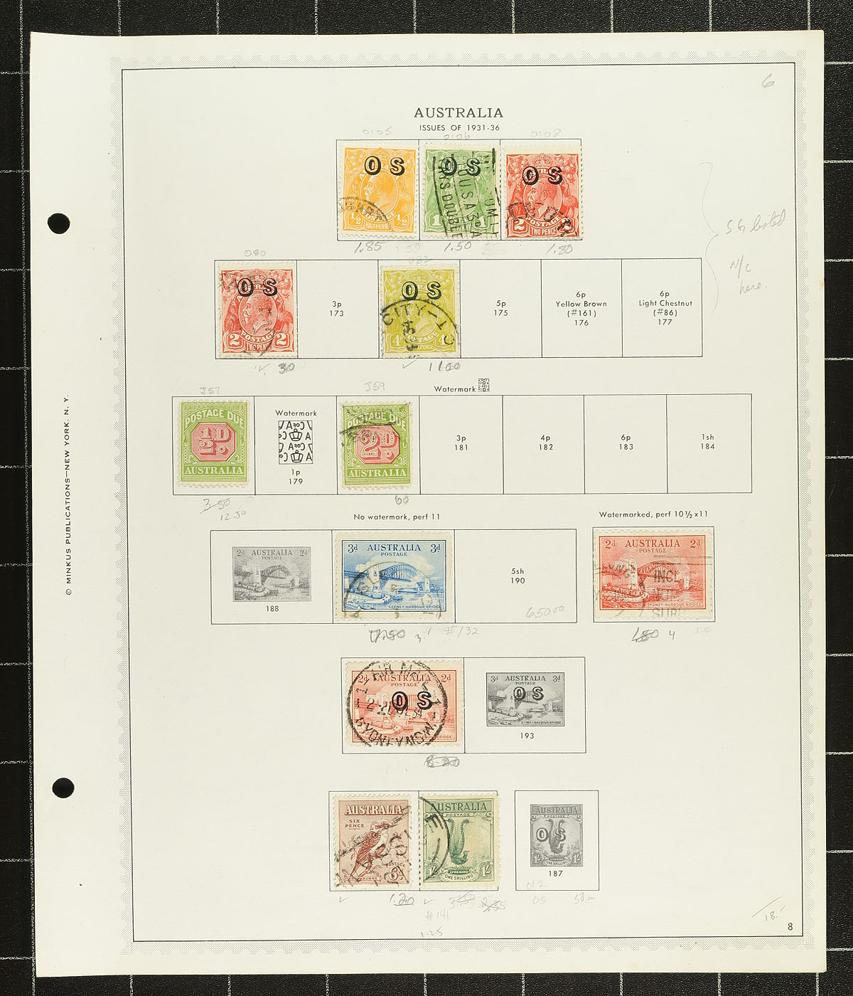 Nice collection of primarily used Australia, 1913-2001, containing a few thousand stamps on roughly 75 homemade and Minkus album pages. The collection generally ranges from Scott #1/1932, and includes a small selection of Kangaroos and KGV Heads, back of the book issues, including officials and postage dues, and much more. A cursory check indicated singles, sets, and partial sets cataloguing $10 and including J86-J95 (mh, c.v. $179 total), leaving other finds to collectors. A nice lot for the Australia collector, and should be continued until completion, overall fine to very fine. Owner's older 2013 Scott US$1,634.00 =
