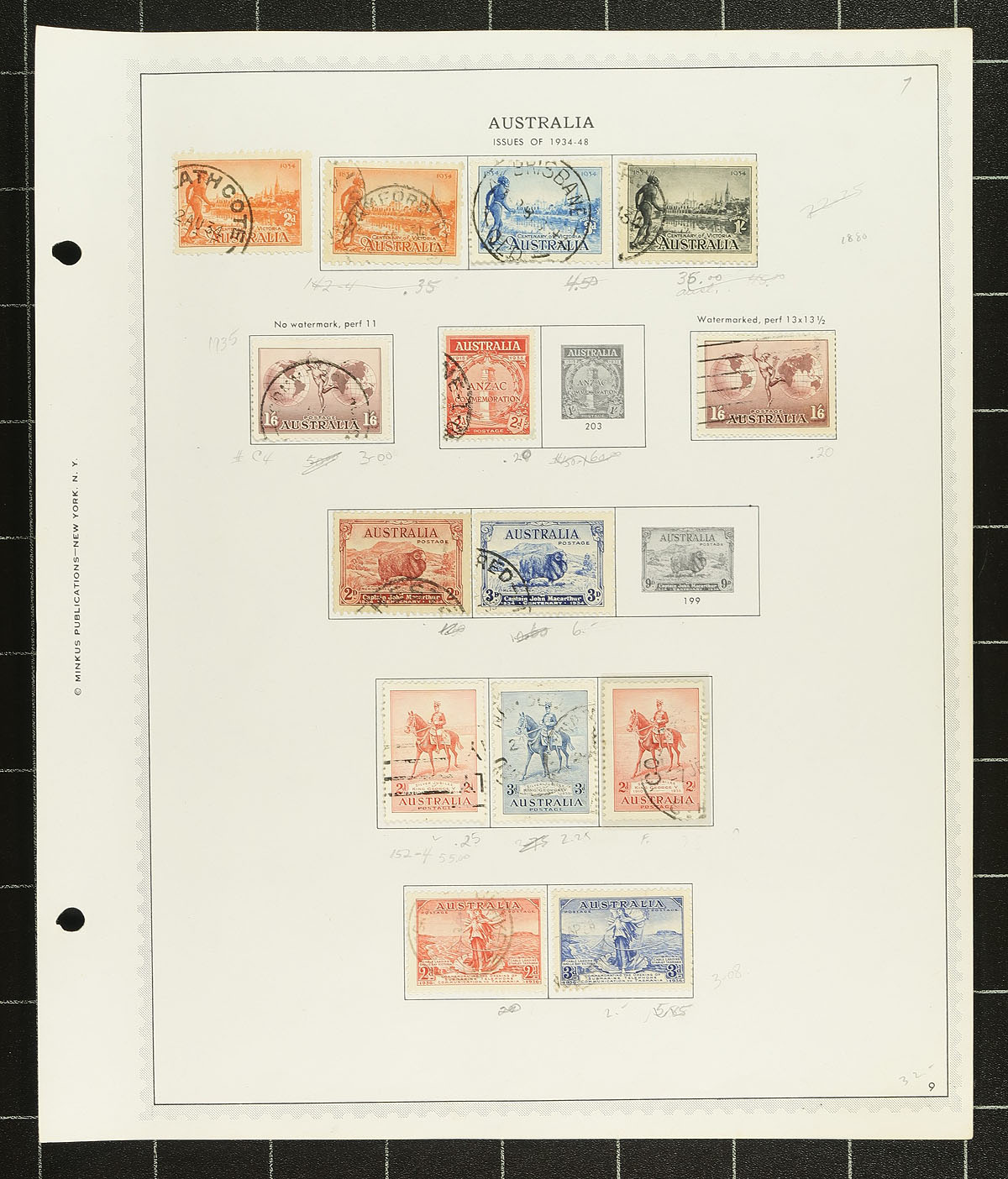 Nice collection of primarily used Australia, 1913-2001, containing a few thousand stamps on roughly 75 homemade and Minkus album pages. The collection generally ranges from Scott #1/1932, and includes a small selection of Kangaroos and KGV Heads, back of the book issues, including officials and postage dues, and much more. A cursory check indicated singles, sets, and partial sets cataloguing $10 and including J86-J95 (mh, c.v. $179 total), leaving other finds to collectors. A nice lot for the Australia collector, and should be continued until completion, overall fine to very fine. Owner's older 2013 Scott US$1,634.00 =