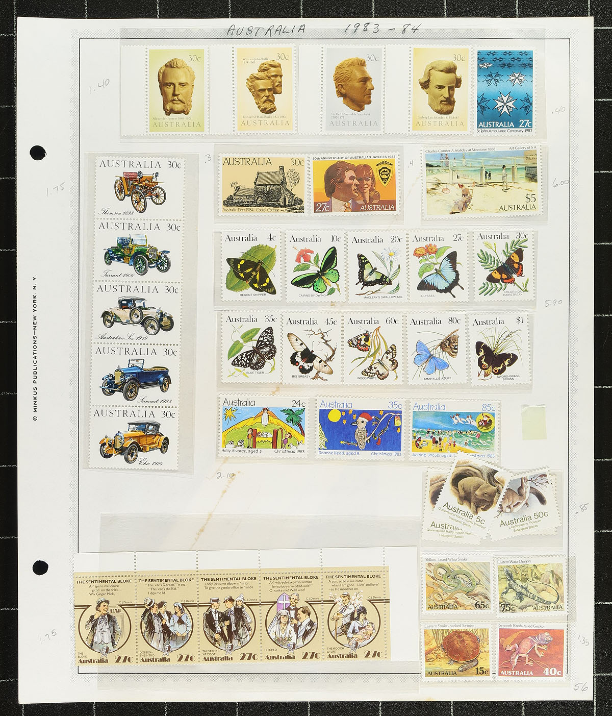 Collection of primarily never hinged Australia, 1979-1990, containing several hundreds of stamps mostly in hingeless mounts on homemade or album pages. This well organized collection generally ranges from Scott #712/1164, and contains gutter pairs, booklets and booklet panes, etc. Owner's Scott catalogue value for the lot totals US$624.00, with face value alone containing at least a few hundred dollars. A good lot for the collector, dealer, or postage user, overall fine to very fine. Estimate =