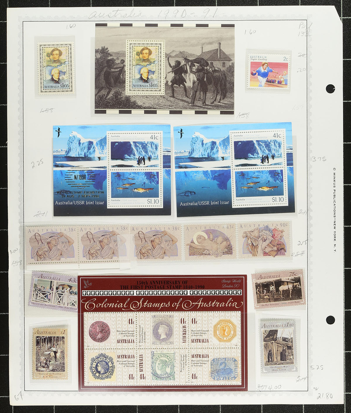 Collection of primarily never hinged Australia, 1979-1990, containing several hundreds of stamps mostly in hingeless mounts on homemade or album pages. This well organized collection generally ranges from Scott #712/1164, and contains gutter pairs, booklets and booklet panes, etc. Owner's Scott catalogue value for the lot totals US$624.00, with face value alone containing at least a few hundred dollars. A good lot for the collector, dealer, or postage user, overall fine to very fine. Estimate =