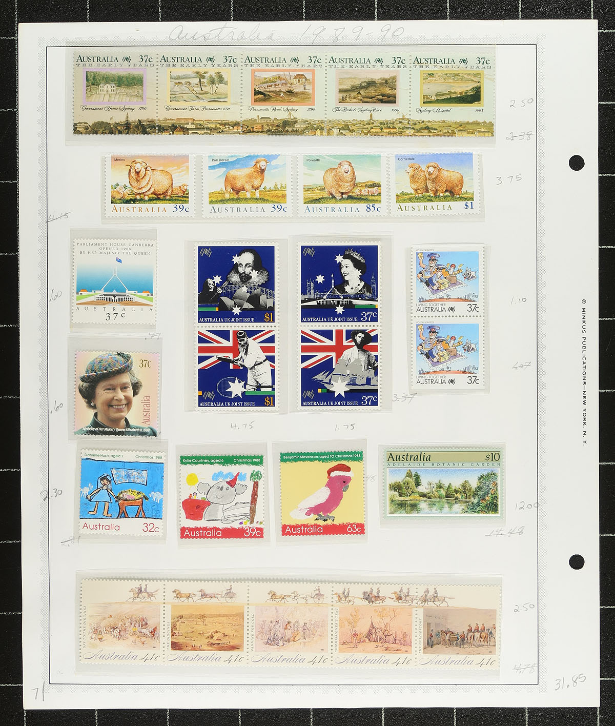 Collection of primarily never hinged Australia, 1979-1990, containing several hundreds of stamps mostly in hingeless mounts on homemade or album pages. This well organized collection generally ranges from Scott #712/1164, and contains gutter pairs, booklets and booklet panes, etc. Owner's Scott catalogue value for the lot totals US$624.00, with face value alone containing at least a few hundred dollars. A good lot for the collector, dealer, or postage user, overall fine to very fine. Estimate =