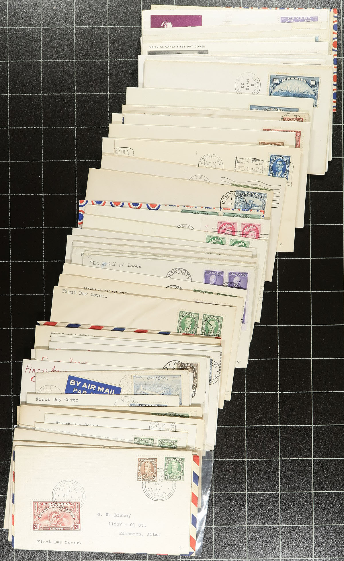 First Day Covers. An earlier selection (1932-1958) of 61 covers, with many better including a complete (matching) set of the 1932 George V Medallion (Unitrade cat $182.00 alone), complete 1935 Silver Jubilee, 1932 Imperial Economic Council (#192), 1933 Royal William (2 covers), 1934 Jacques Cartier / Empire Loyalists, 1933 UPU Conference (2 covers), 1935 Special Delivery (E6, cat $40.00) and a good variety of late George VI and early QEII era. Several better private cachet covers noted. The catalogue value will add up quickly her! Estimate =