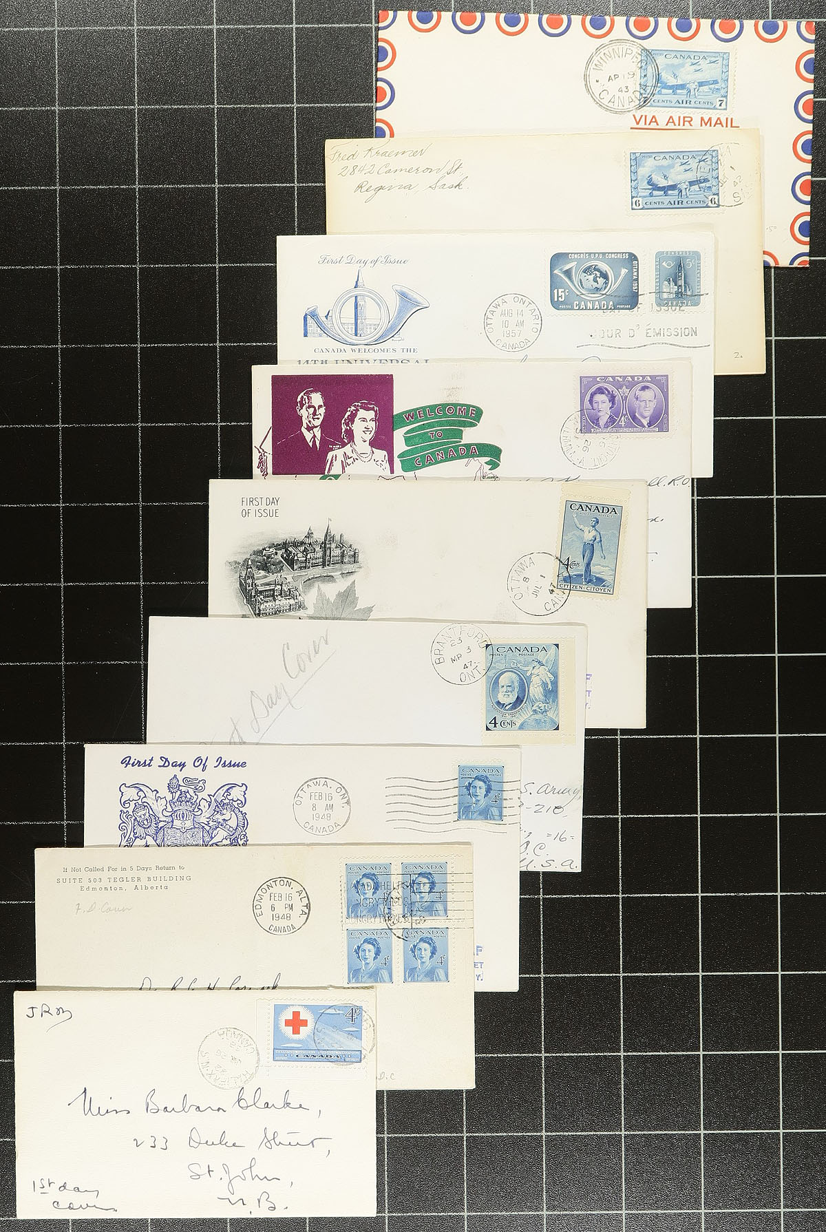 First Day Covers. An earlier selection (1932-1958) of 61 covers, with many better including a complete (matching) set of the 1932 George V Medallion (Unitrade cat $182.00 alone), complete 1935 Silver Jubilee, 1932 Imperial Economic Council (#192), 1933 Royal William (2 covers), 1934 Jacques Cartier / Empire Loyalists, 1933 UPU Conference (2 covers), 1935 Special Delivery (E6, cat $40.00) and a good variety of late George VI and early QEII era. Several better private cachet covers noted. The catalogue value will add up quickly her! Estimate =