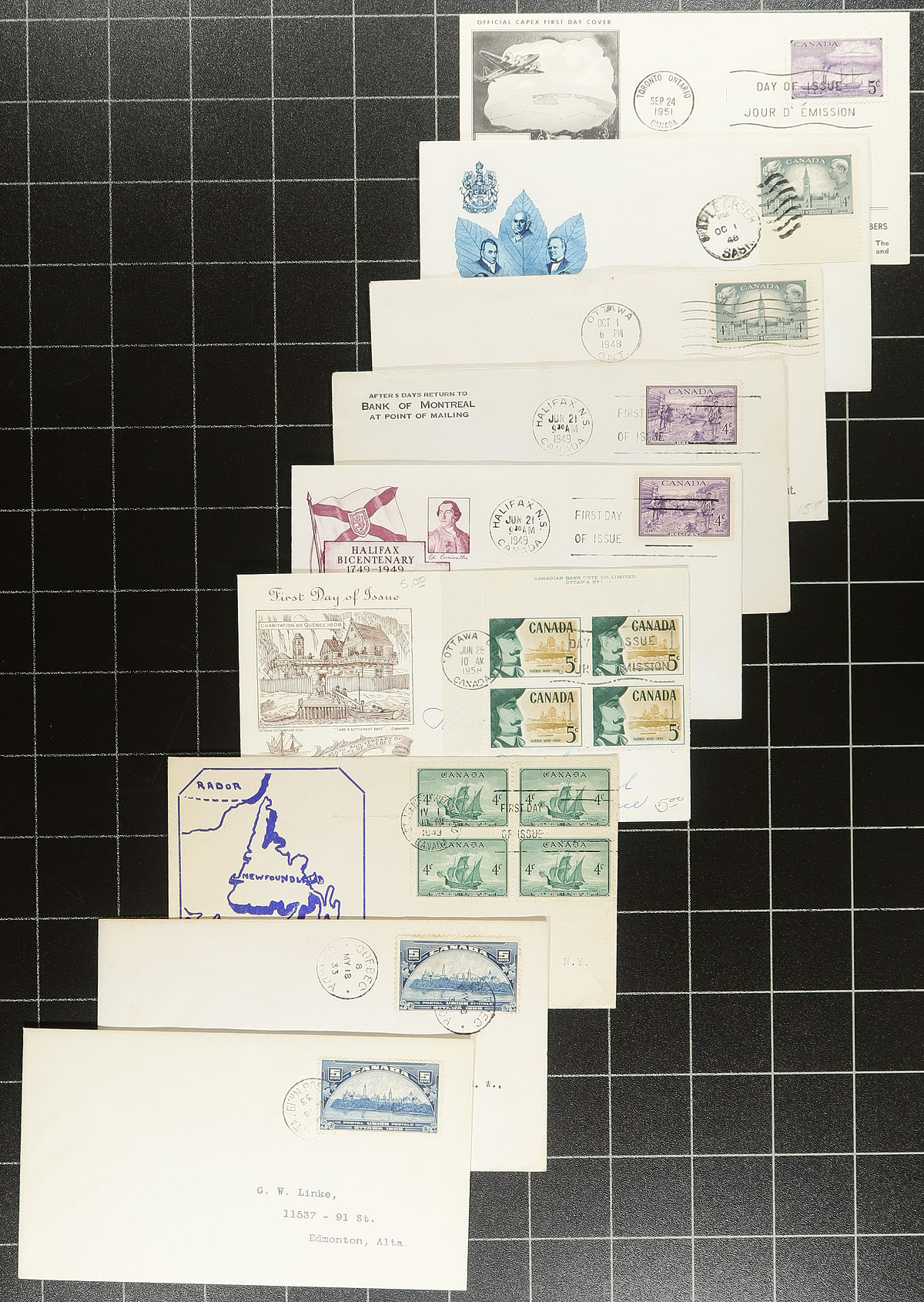 First Day Covers. An earlier selection (1932-1958) of 61 covers, with many better including a complete (matching) set of the 1932 George V Medallion (Unitrade cat $182.00 alone), complete 1935 Silver Jubilee, 1932 Imperial Economic Council (#192), 1933 Royal William (2 covers), 1934 Jacques Cartier / Empire Loyalists, 1933 UPU Conference (2 covers), 1935 Special Delivery (E6, cat $40.00) and a good variety of late George VI and early QEII era. Several better private cachet covers noted. The catalogue value will add up quickly her! Estimate =