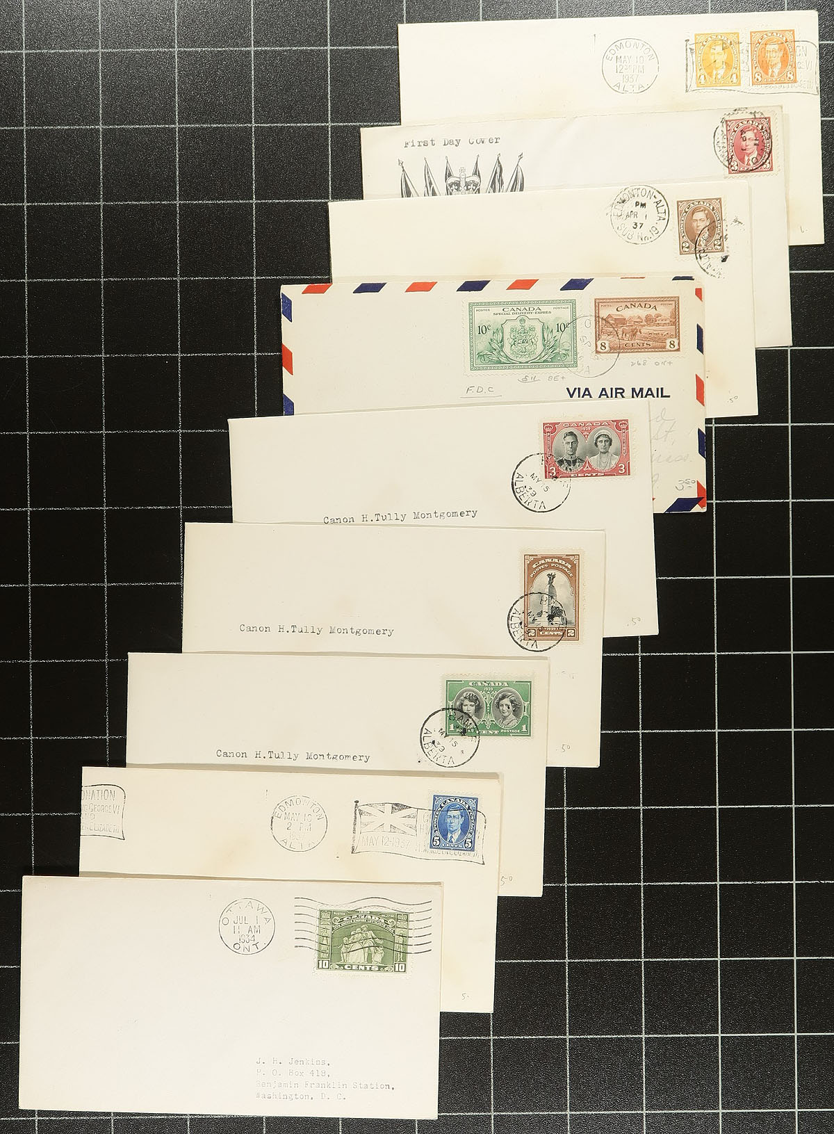 First Day Covers. An earlier selection (1932-1958) of 61 covers, with many better including a complete (matching) set of the 1932 George V Medallion (Unitrade cat $182.00 alone), complete 1935 Silver Jubilee, 1932 Imperial Economic Council (#192), 1933 Royal William (2 covers), 1934 Jacques Cartier / Empire Loyalists, 1933 UPU Conference (2 covers), 1935 Special Delivery (E6, cat $40.00) and a good variety of late George VI and early QEII era. Several better private cachet covers noted. The catalogue value will add up quickly her! Estimate =