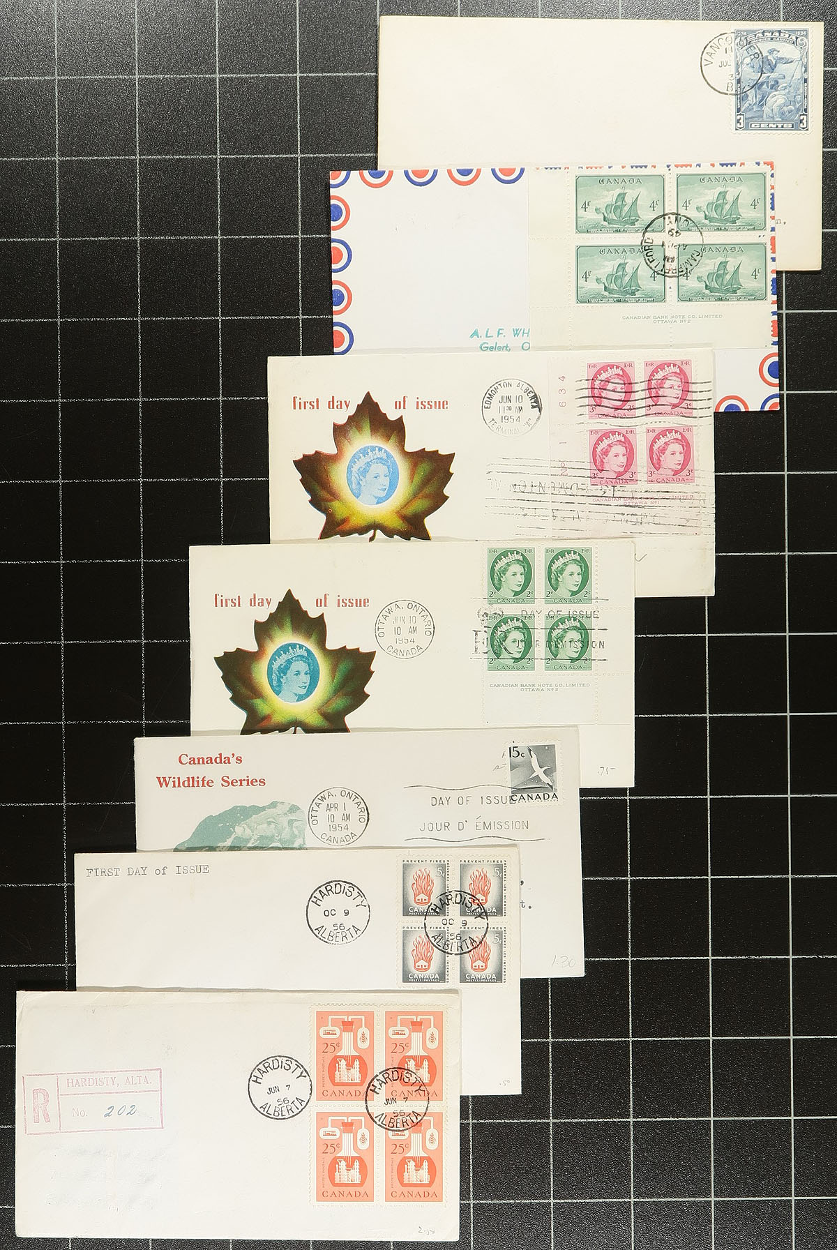First Day Covers. An earlier selection (1932-1958) of 61 covers, with many better including a complete (matching) set of the 1932 George V Medallion (Unitrade cat $182.00 alone), complete 1935 Silver Jubilee, 1932 Imperial Economic Council (#192), 1933 Royal William (2 covers), 1934 Jacques Cartier / Empire Loyalists, 1933 UPU Conference (2 covers), 1935 Special Delivery (E6, cat $40.00) and a good variety of late George VI and early QEII era. Several better private cachet covers noted. The catalogue value will add up quickly her! Estimate =