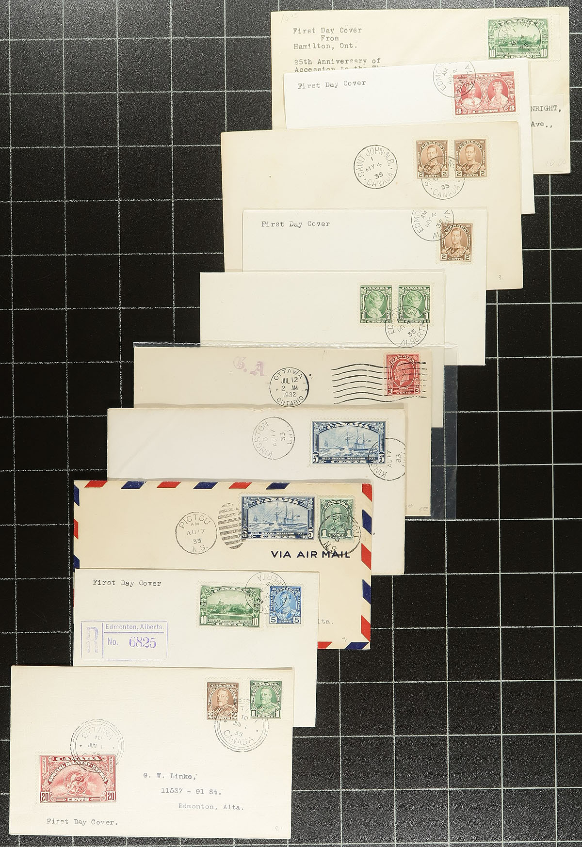 First Day Covers. An earlier selection (1932-1958) of 61 covers, with many better including a complete (matching) set of the 1932 George V Medallion (Unitrade cat $182.00 alone), complete 1935 Silver Jubilee, 1932 Imperial Economic Council (#192), 1933 Royal William (2 covers), 1934 Jacques Cartier / Empire Loyalists, 1933 UPU Conference (2 covers), 1935 Special Delivery (E6, cat $40.00) and a good variety of late George VI and early QEII era. Several better private cachet covers noted. The catalogue value will add up quickly her! Estimate =