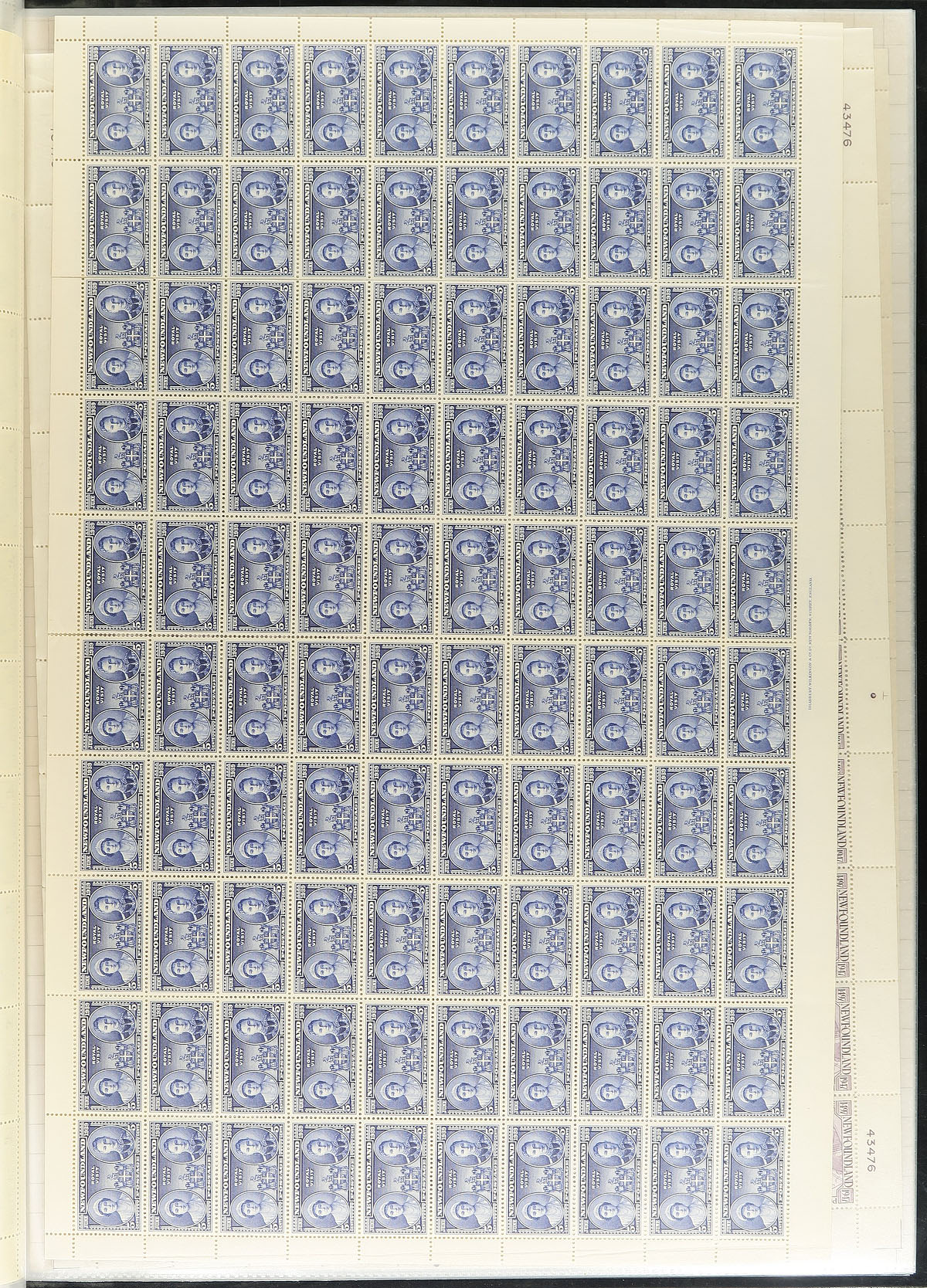 Compete sheet holding. A seldom offered assembly of full sheets, including 1c Codfish (#233, including "Fish Hook" variety), 1939 Royal Visit (#249), 1941-1944 Princess Elizabeth (#256, two sheets), 1947 QEII "Birthday" (#269 x2, one with plate #43359 all four corners, the other without), 1941 Grenfell issue (#252, two sheets, full inscriptions all four corners), 1947 Cabot issue (#270, two sheets, in to clearly different shades of violet) and 1943 St. Johns Airmail (C19). All in formats of 100 stamps per sheet. Valued as singles and plate blocks, but certainly worth more as full sheets! 2024 Unitrade =