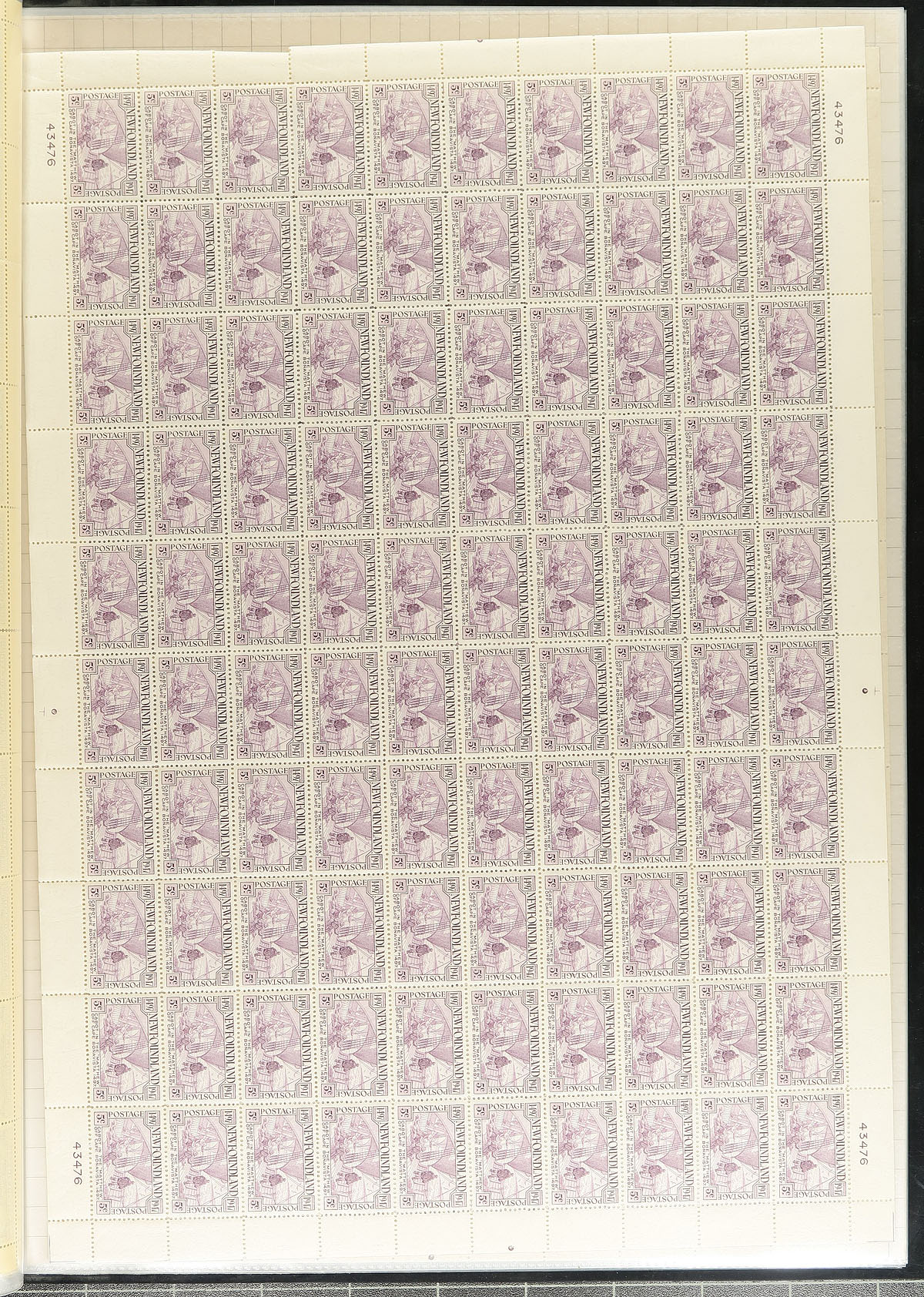 Compete sheet holding. A seldom offered assembly of full sheets, including 1c Codfish (#233, including "Fish Hook" variety), 1939 Royal Visit (#249), 1941-1944 Princess Elizabeth (#256, two sheets), 1947 QEII "Birthday" (#269 x2, one with plate #43359 all four corners, the other without), 1941 Grenfell issue (#252, two sheets, full inscriptions all four corners), 1947 Cabot issue (#270, two sheets, in to clearly different shades of violet) and 1943 St. Johns Airmail (C19). All in formats of 100 stamps per sheet. Valued as singles and plate blocks, but certainly worth more as full sheets! 2024 Unitrade =
